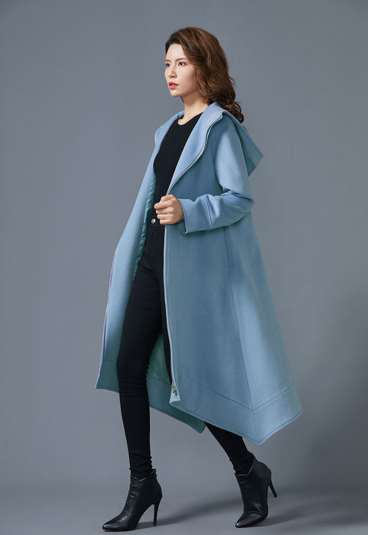 Blue Hooded long wool coat Asymmetric handmade coat coat with pockets C1623