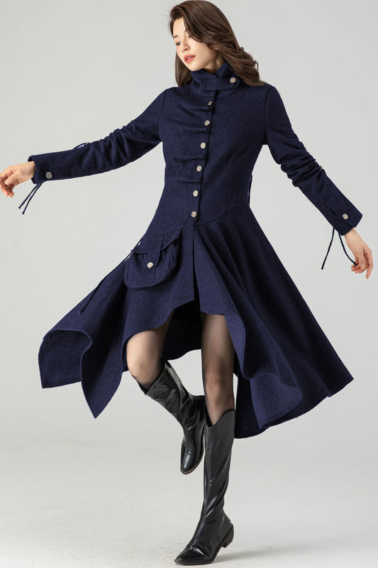 Asymmetrical Single Breasted Navy Blue Wool Coat C4518
