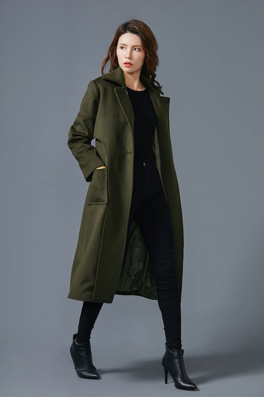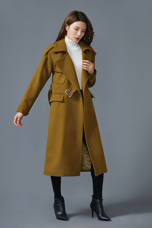 Women's winter wool coat Military coat midi pockets belt coat C1592