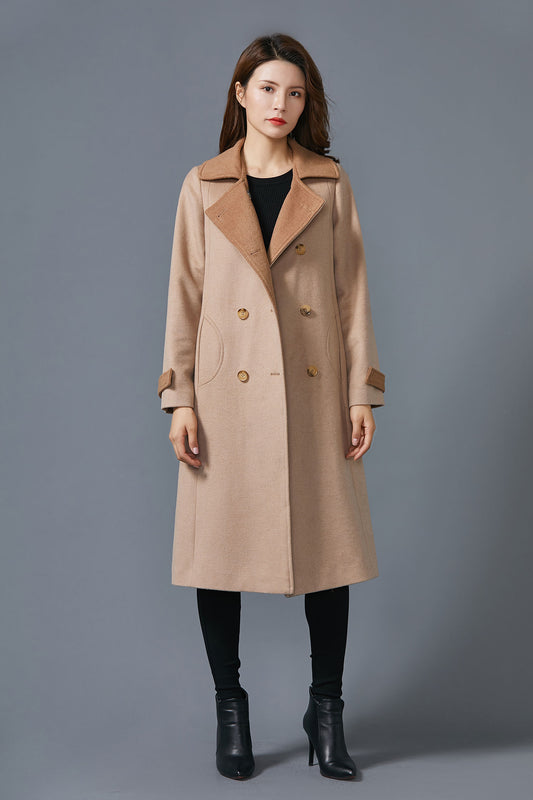 Woolen trench coat Midi light brown coat patchwork wool coat double breasted handmade coat C1594