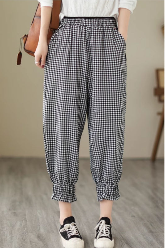 White Linen Casual Cropped Elastic Waist Pants C2294