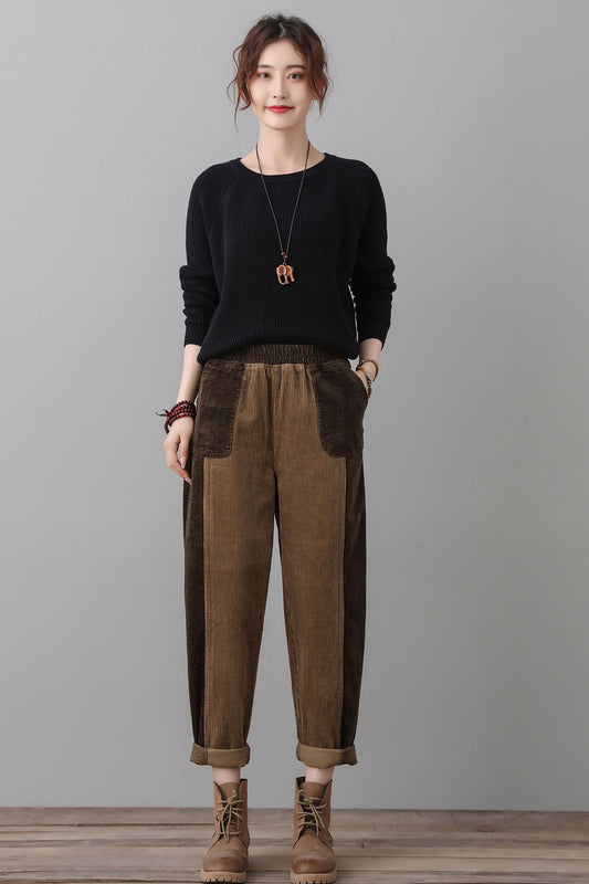 Women's Tapered Pants, Elastic Waist Corduroy Pants C3509