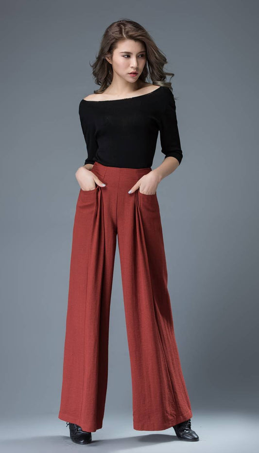 High waisted pants, linen trousers, womens pants, wide leg pants, long trousers, red pants, pleated pants, flared pants, casual pants C827