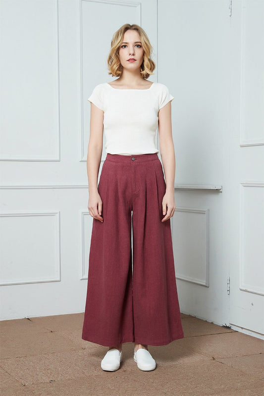 High Waisted Wide Pants, Linen Pants, Wide Leg Pants, red pants, pleated culottes, Zip front Buttoned Front Pleated Wide Leg Pants C1399