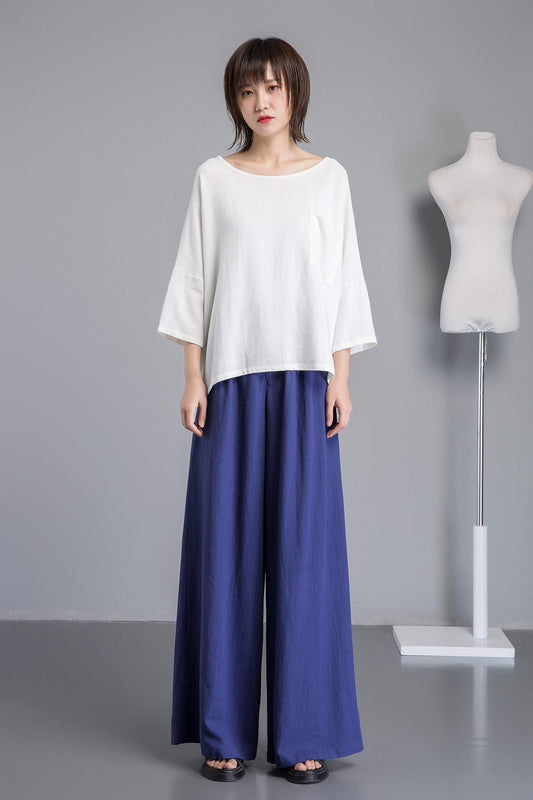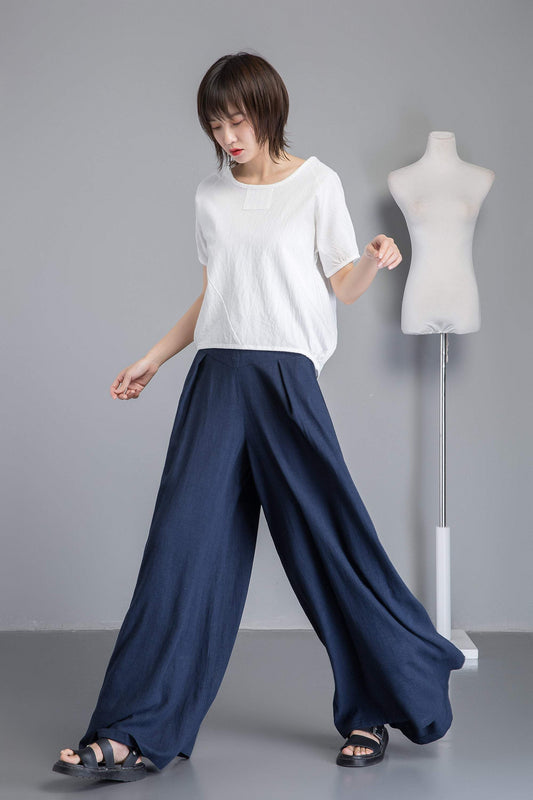 Blue linen pants, wide leg pants for elegant women, long blue linen pants for summer, custom plus size loose and casual pants C1266