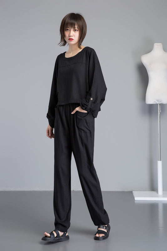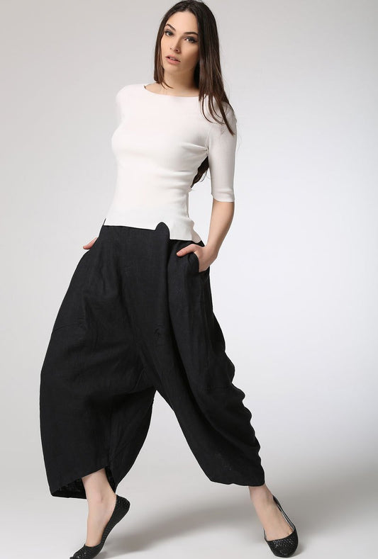 Black pants, linen pants, harem pants, plus size pants, black linen pants, pocket pants, loose pants, casual pants, linen harem pants C423