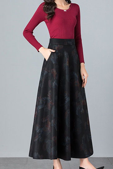 Retro Flower Print Warm Long Wool Skirt C2474
