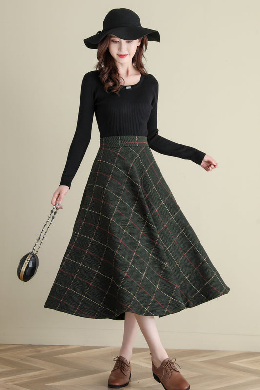 Winter Green Midi Wool Plaid Skirt, Swing Tartan wool Skirt C251201