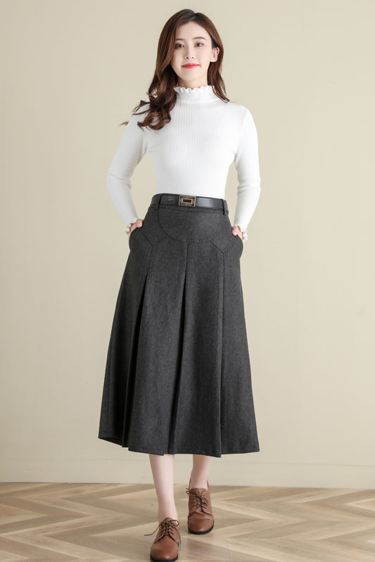 Grey Pleated Midi Wool Skirt Women, A Line Skirt with Pockets, Solid Skirt C251401