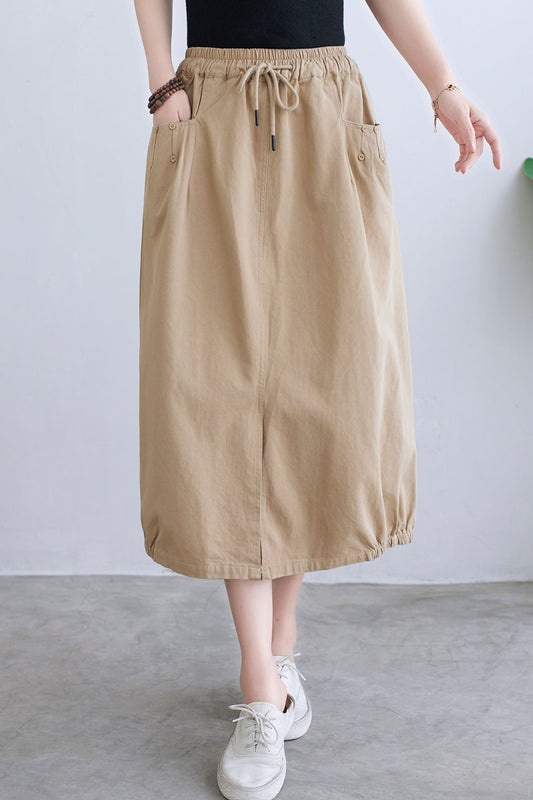Khaki Casual Elastic Waist Split Linen Skirt C2293#YY05119
