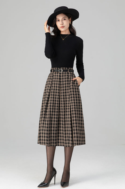 Vintage Pleated Midi Plaid Wool Skirt C5198