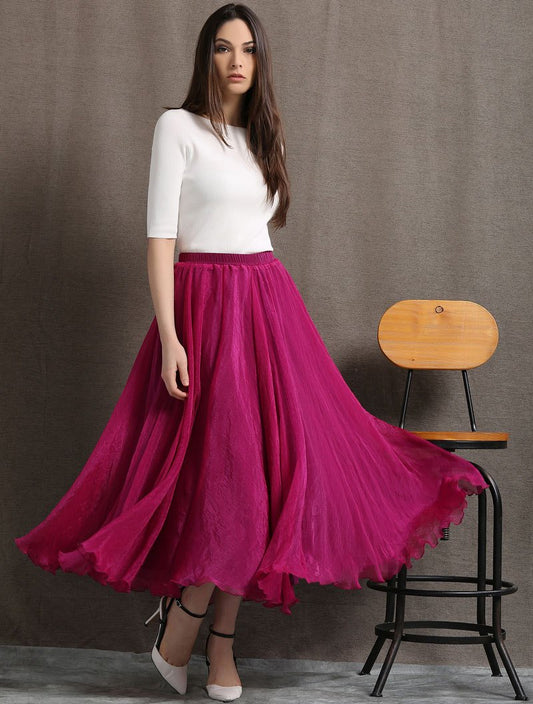 Fuchsia Pink Skirt - Bright Flared Elegant Flowing Chiffon Women's Skirt with Ruffle Hem & Elasticated Waist Plus Size Clothing (C406)