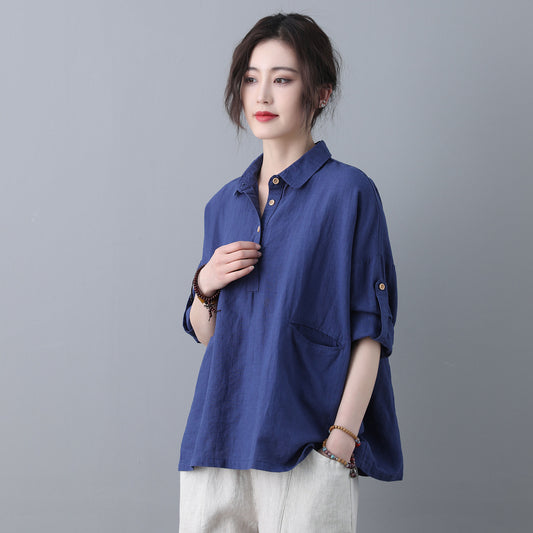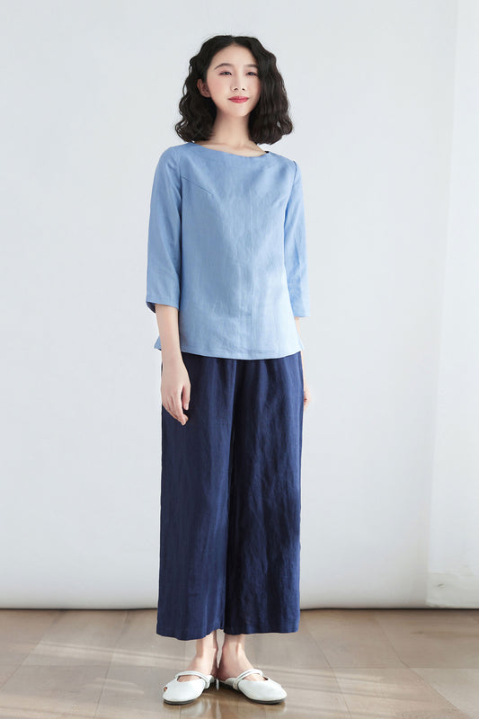 Blue Casual V Neck Linen Blouses for Women C2278#CK2100841