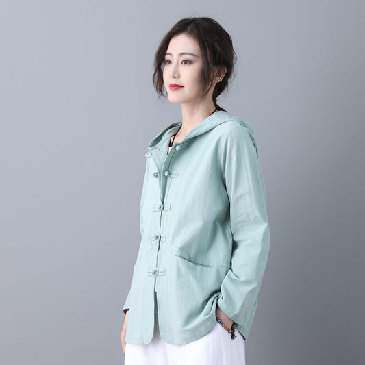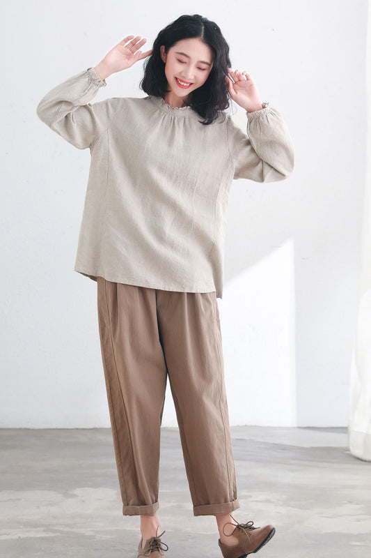 Back Buttons Long Sleeve Ruffle Linen Tops C2717