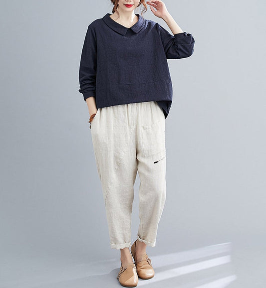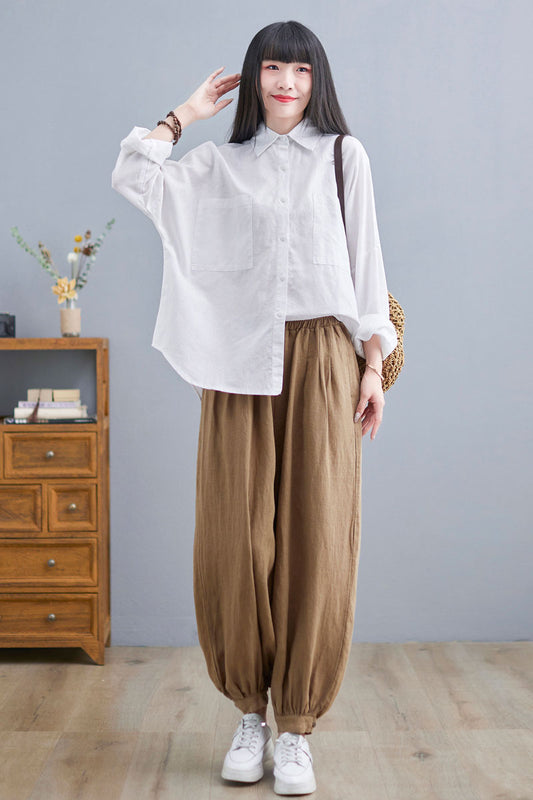 Long Sleeve Linen Shirt Tops in White C2271#YY05133