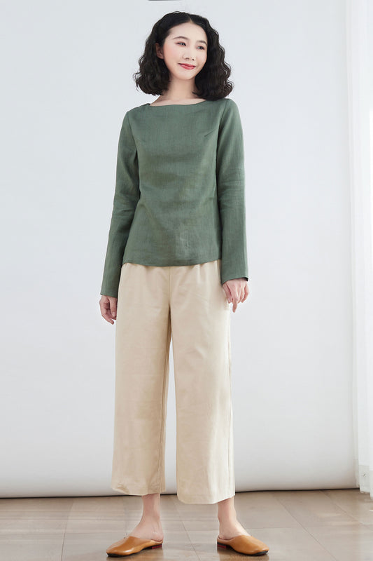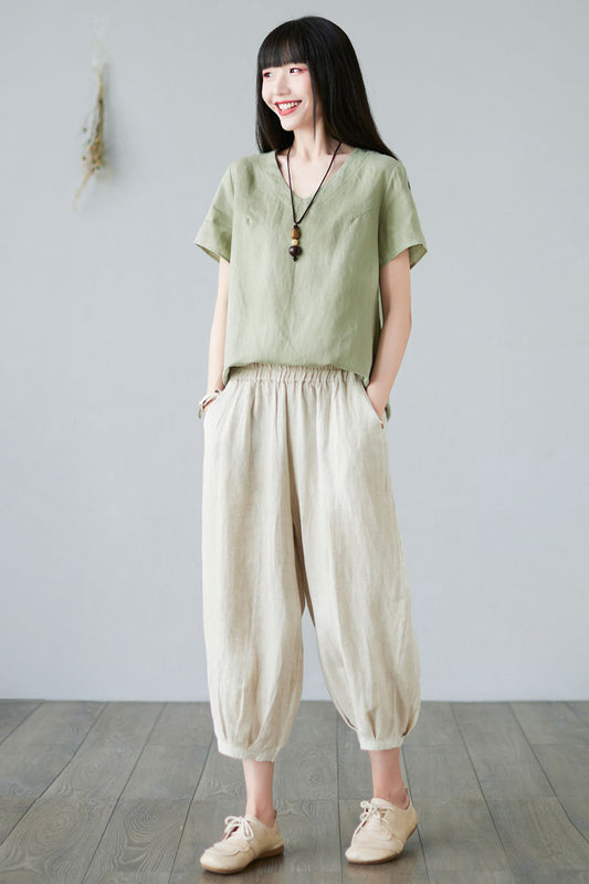 Green Casual V Neck Linen Blouses for Women C2278#YY05092