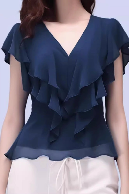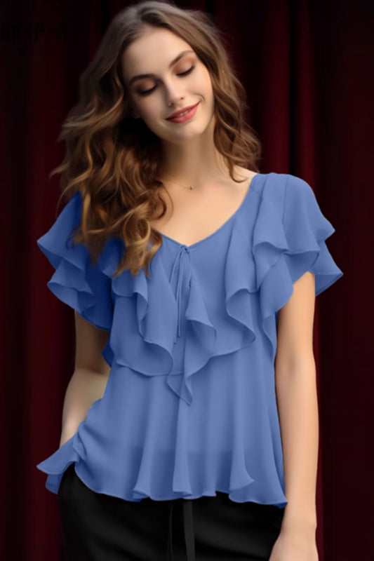 V neck ruffle summer chiffon blouse C5056