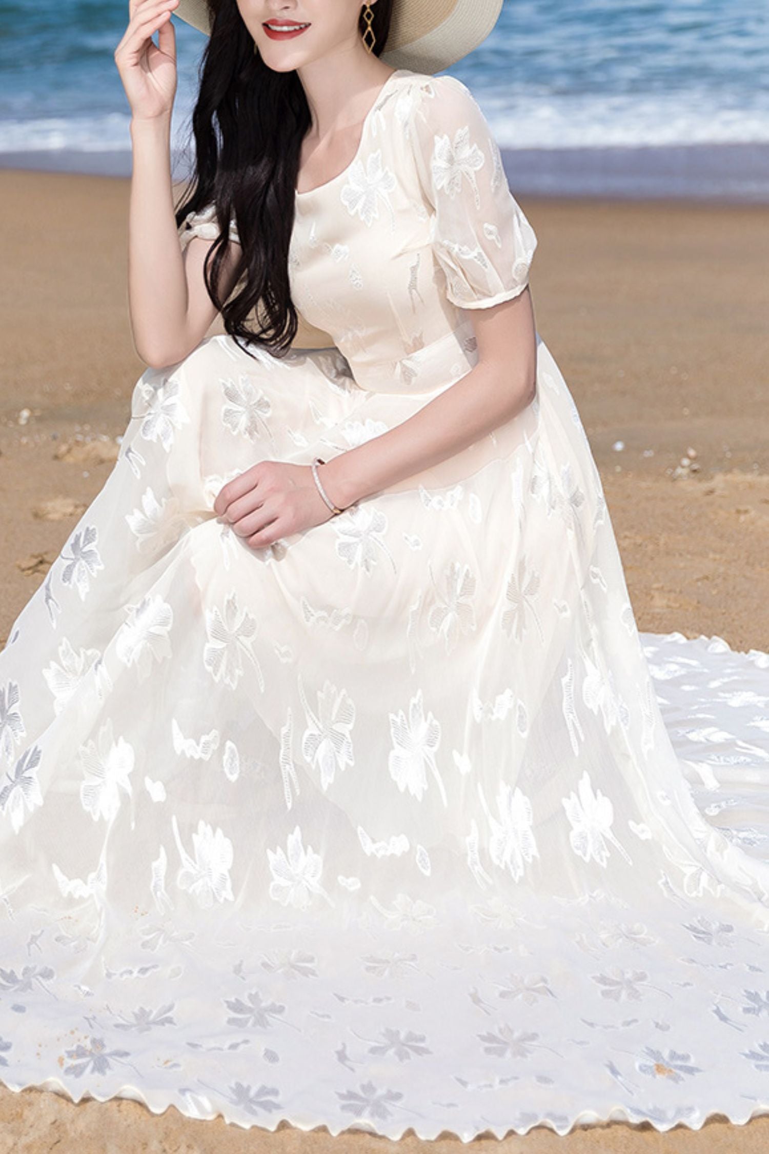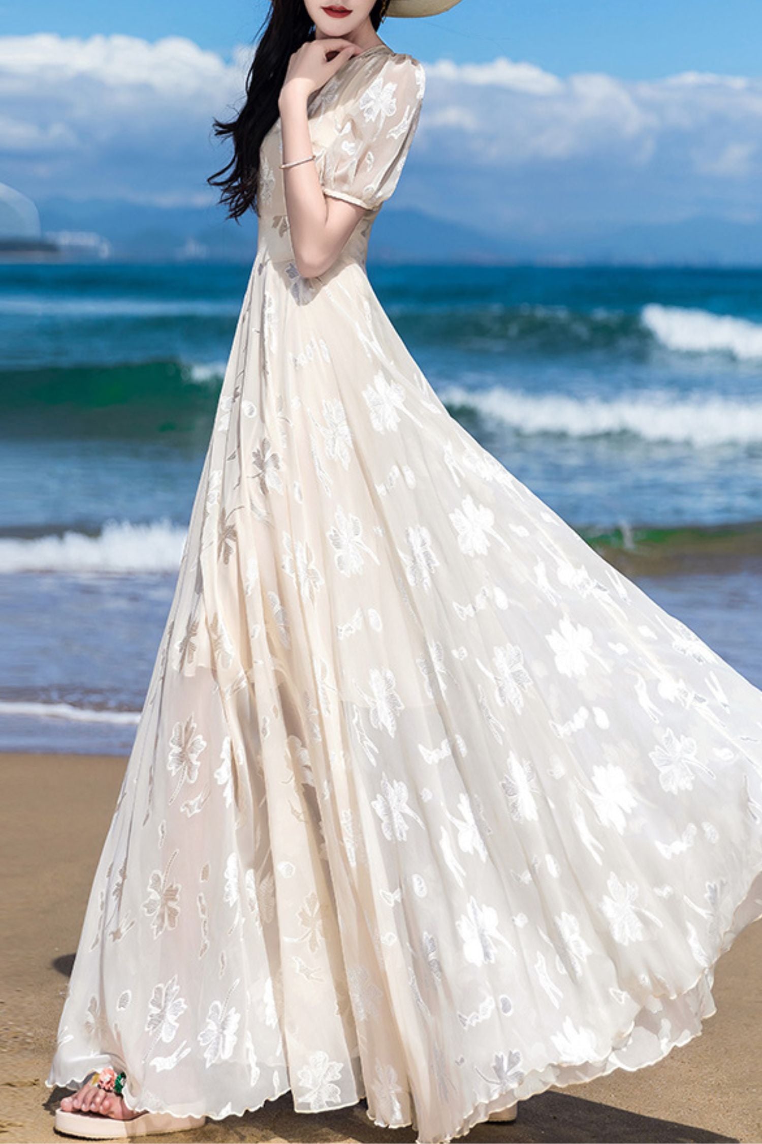 Beige chiffon women summer new long round neck dress C4092