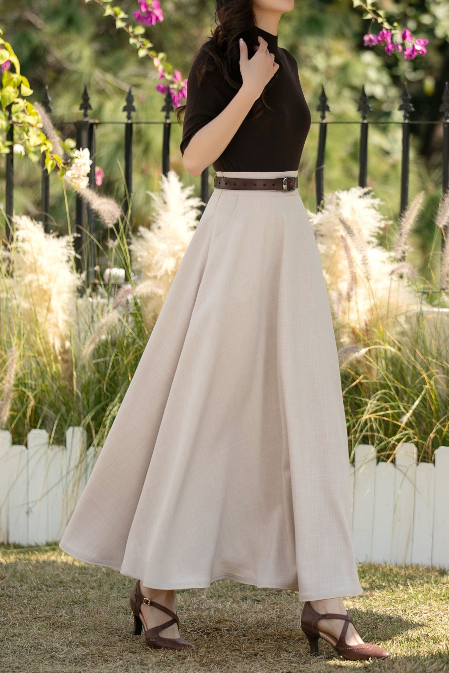 Beige Linen Cotton Maxi Skirt: High Waisted A-Line Summer Skirt, Ylistyle C5443