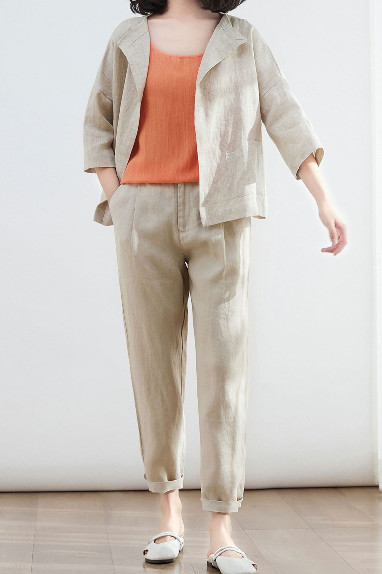 Beige Linen Womens Plus Size Pants with Pockets C2873