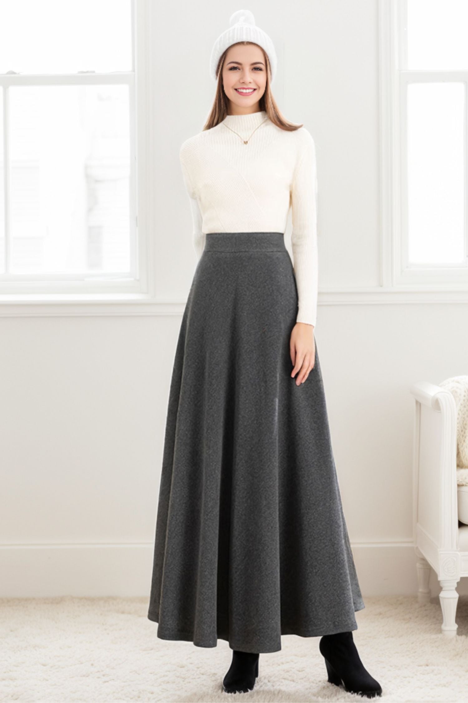 Long Wool A-Line Maxi Skirt With Pockets C4263