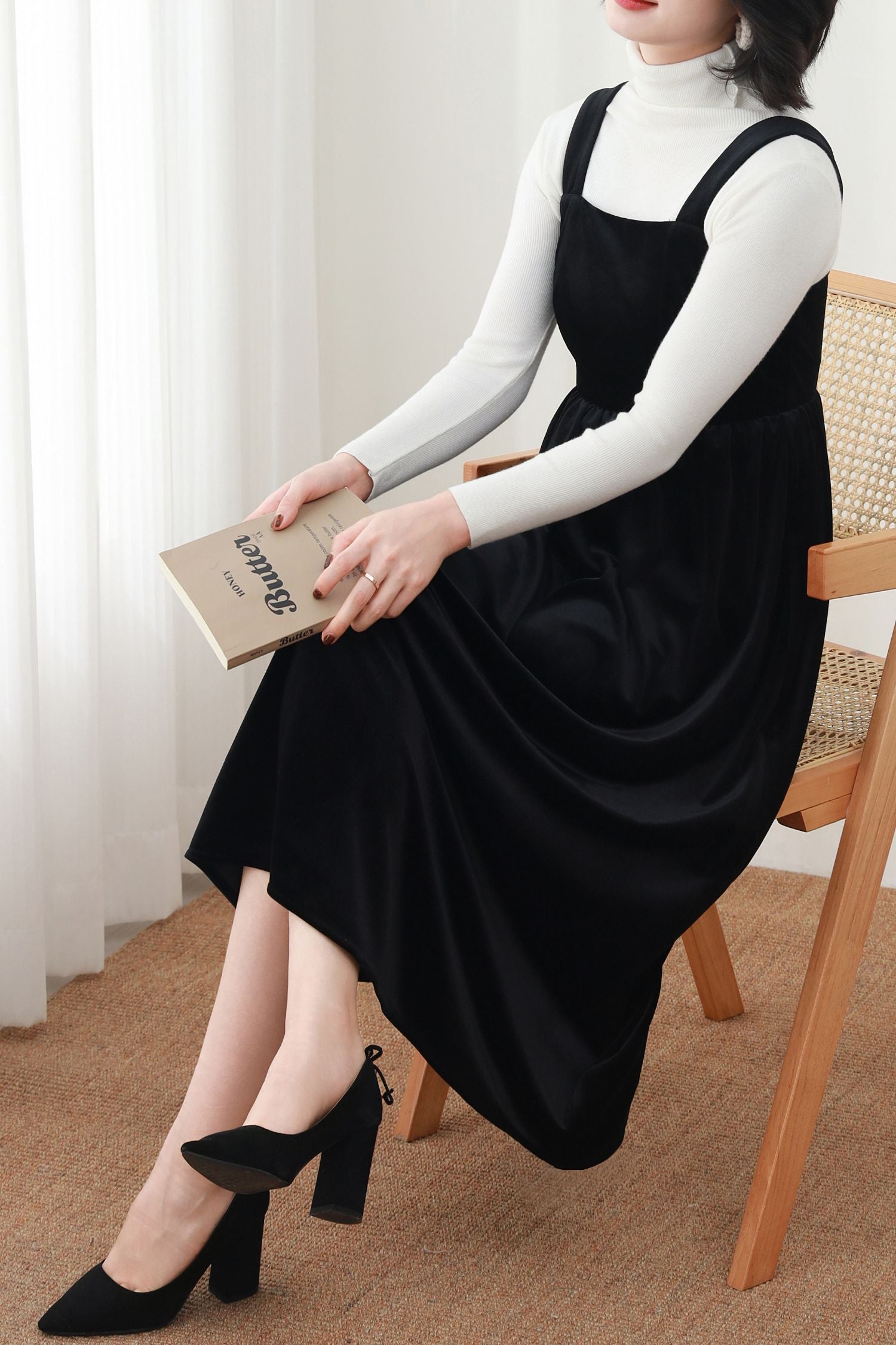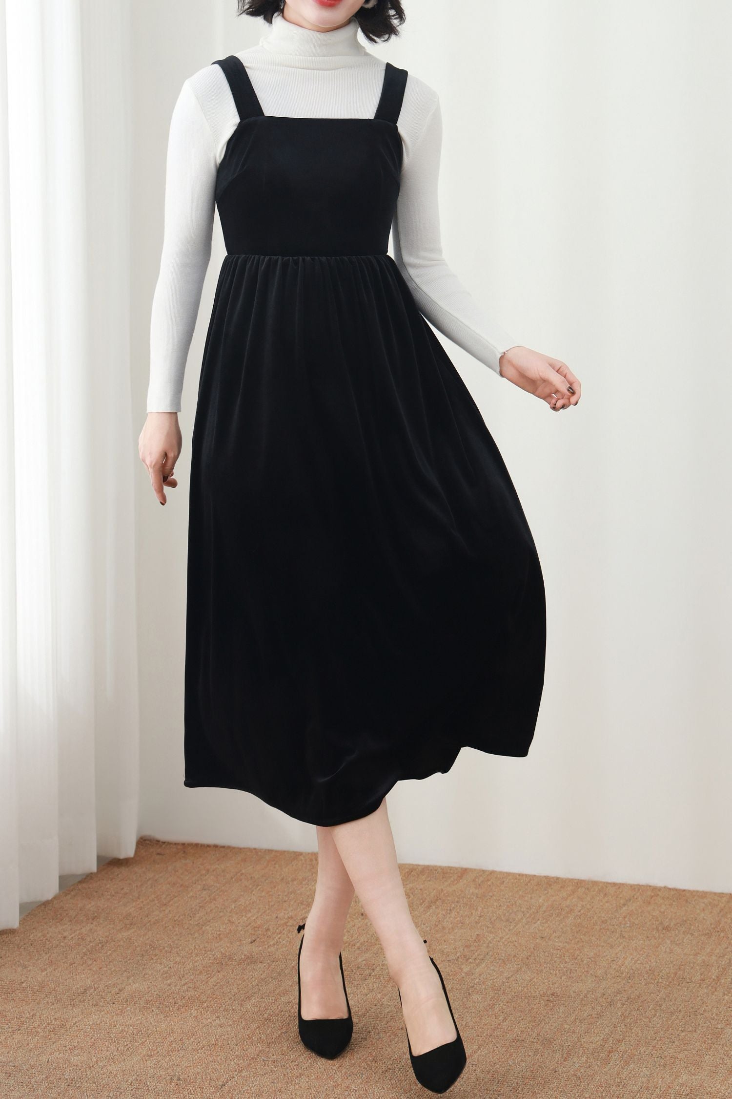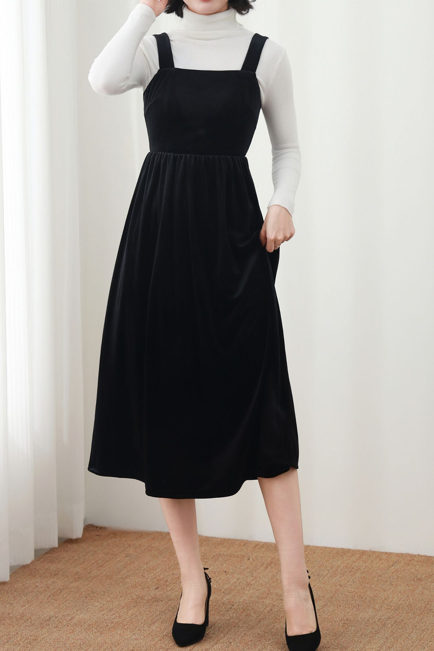 Black Velvet Midi Dress – Sleeveless A-Line Pinafore Dress with Square Neck, Autumn Winter Wear, Handmade, Ylistyle C5447