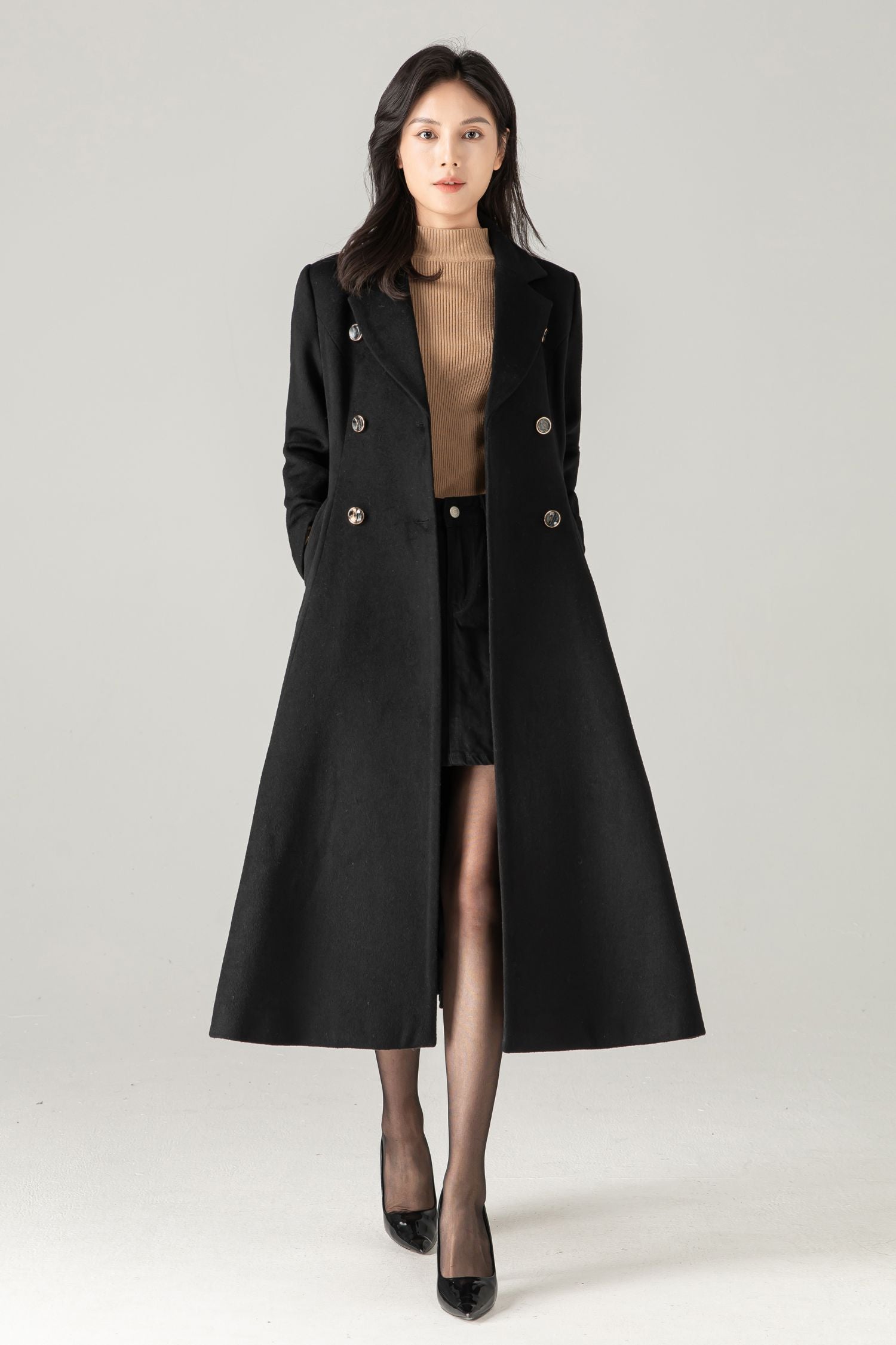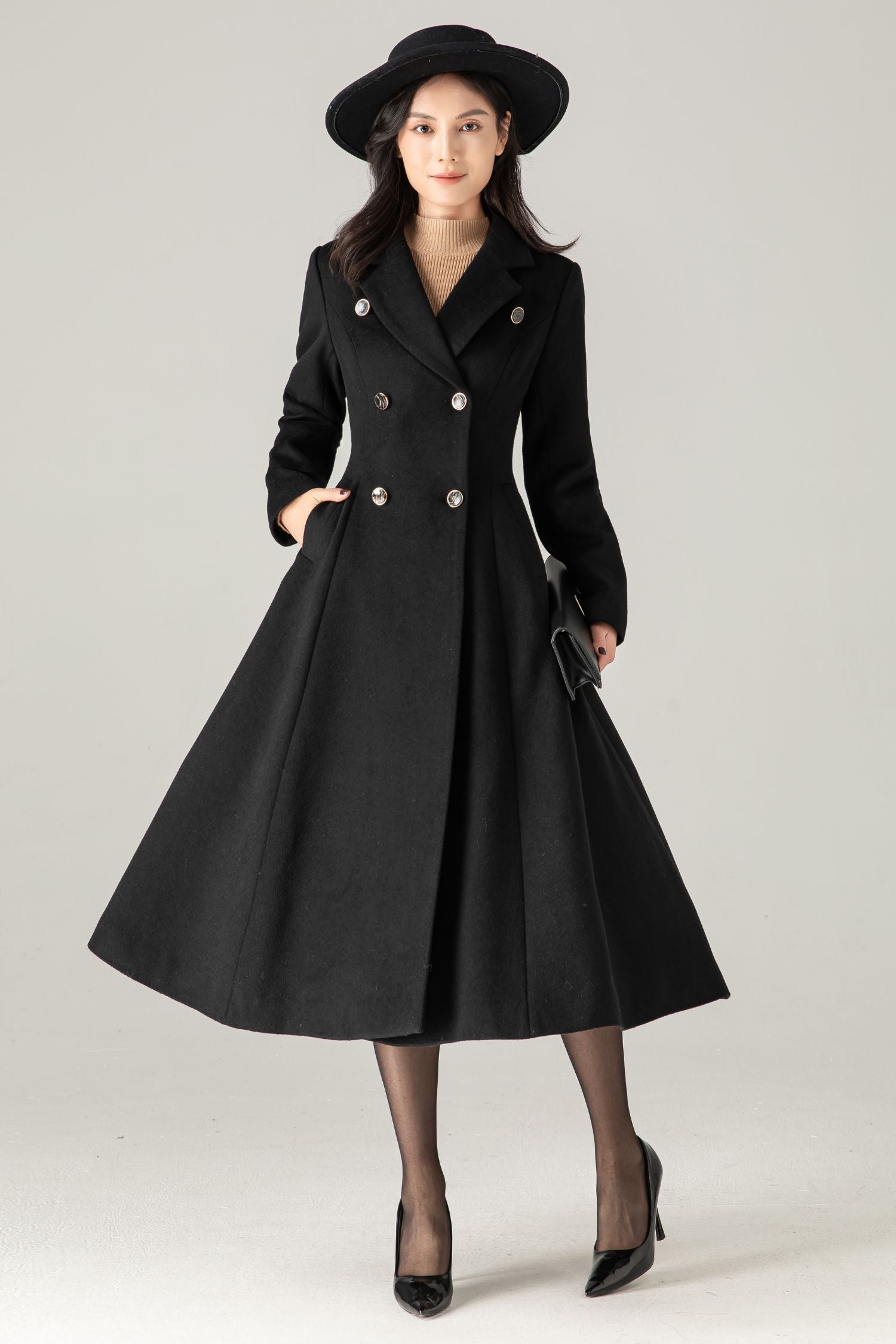 This black wool-blend maxi coat for women featuring a vintage-inspired swing silhouette and double-breasted design — a warm, elegant winter overcoat crafted for structure and timeless style. offering comfort and versatility for everyday wear, travel, and special outings.