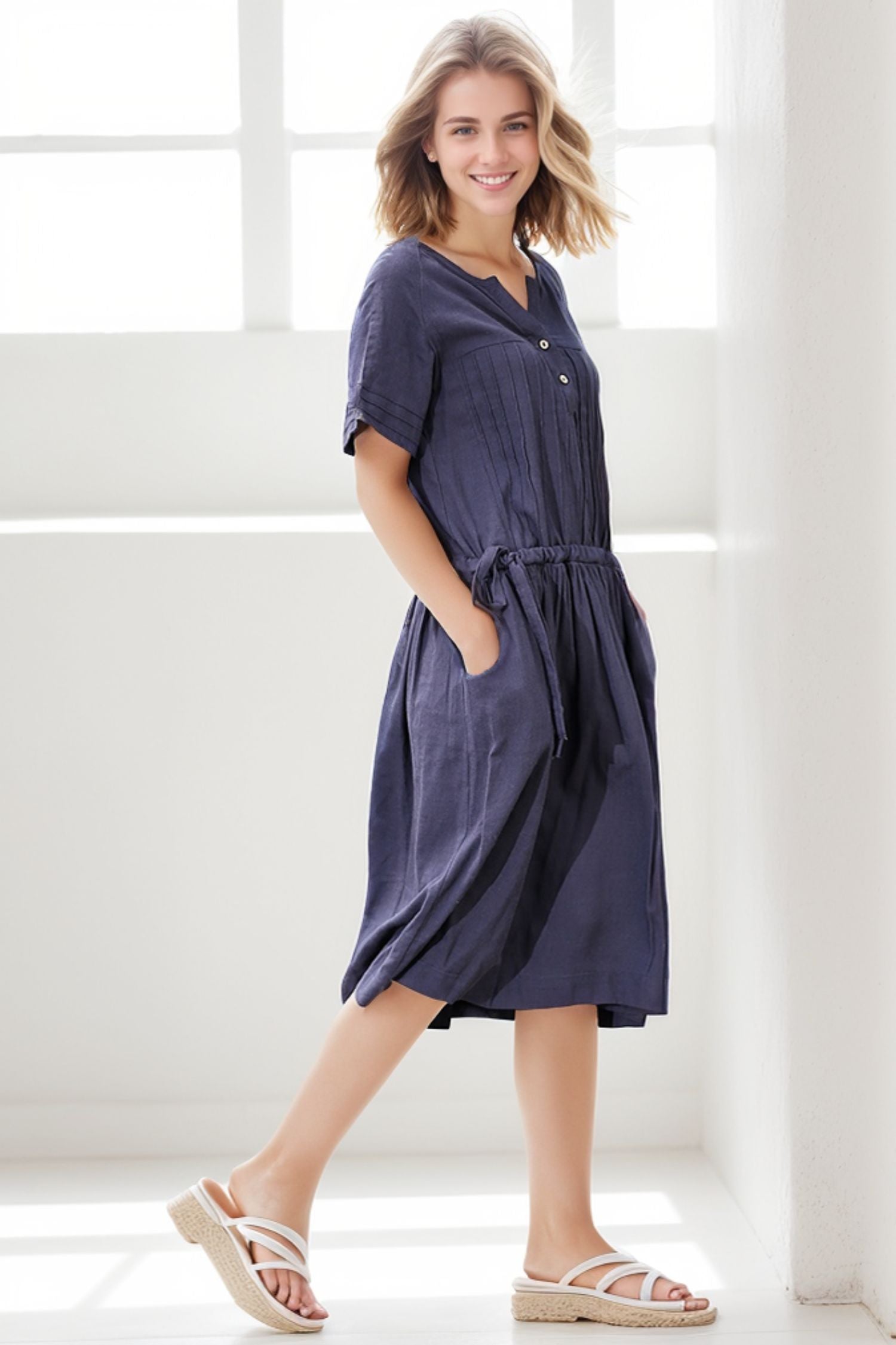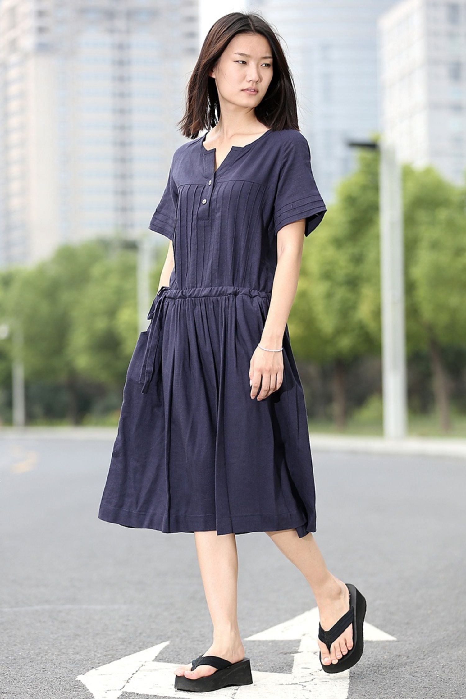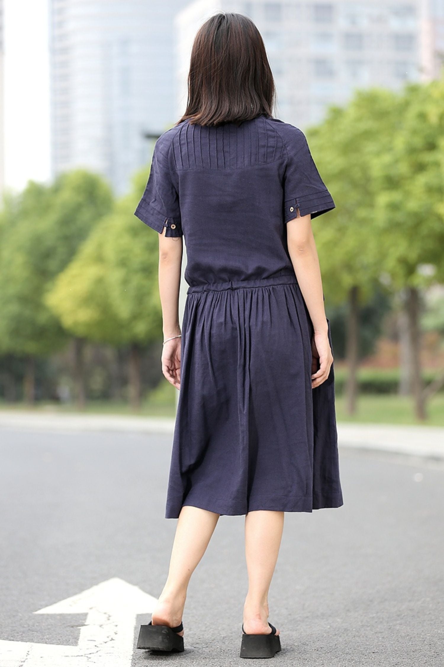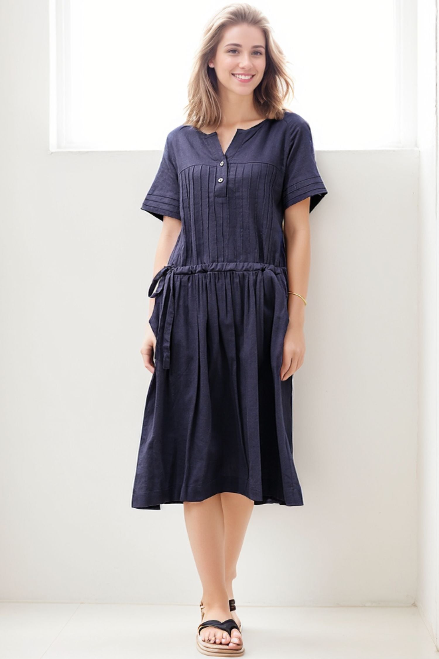 Casual Navy Blue Short-Sleeved Pleated Mid-Length Dress for Women C268