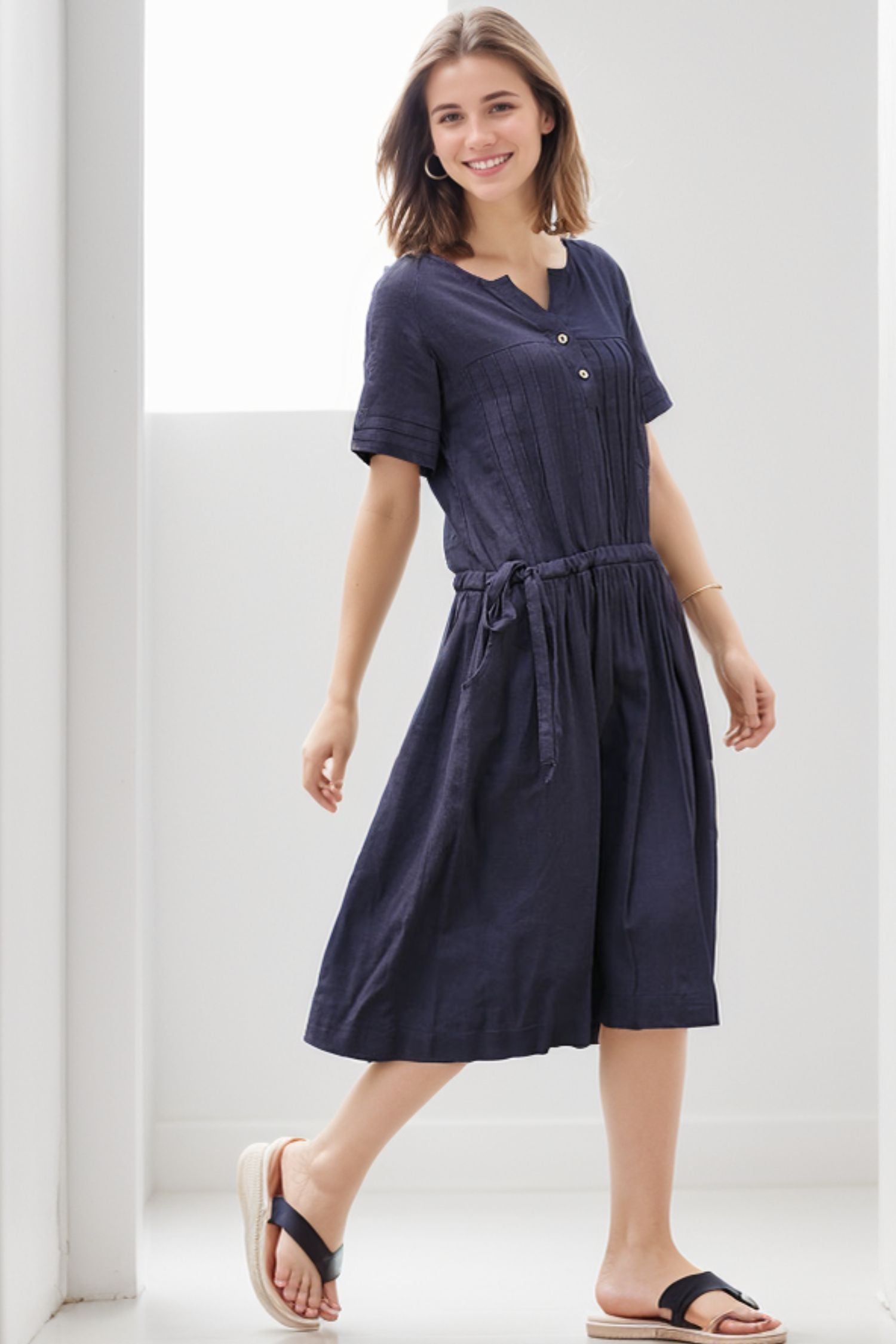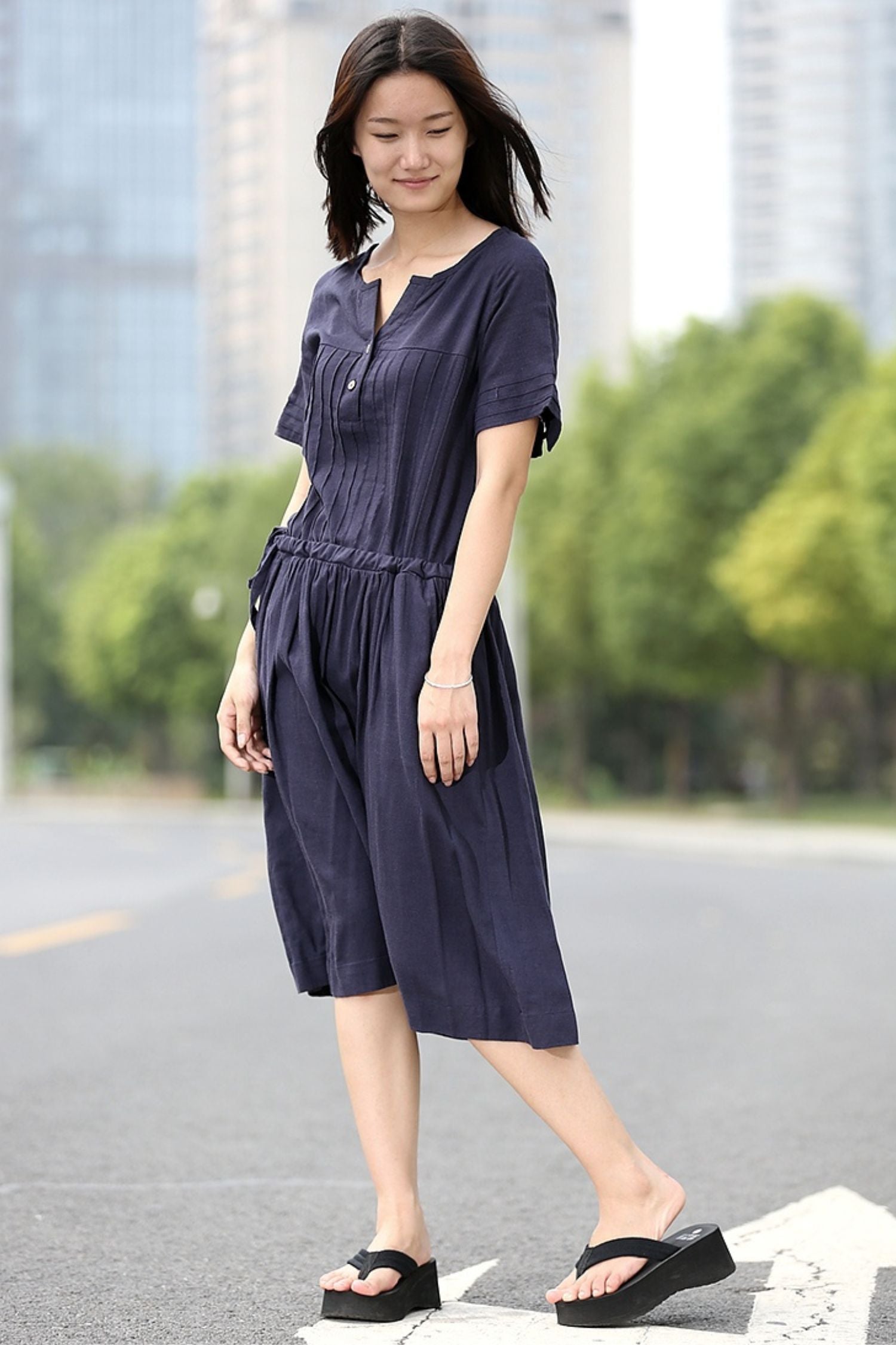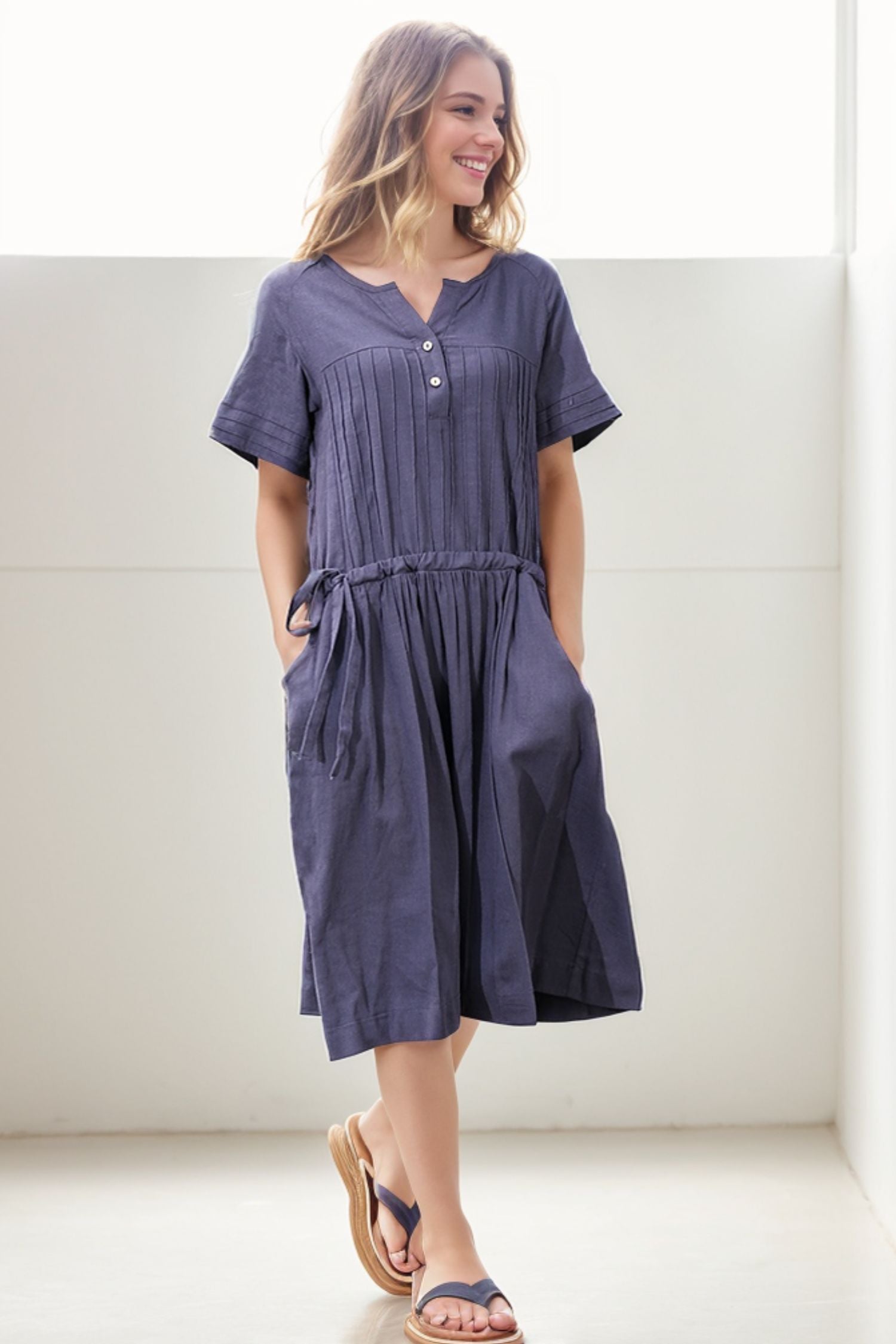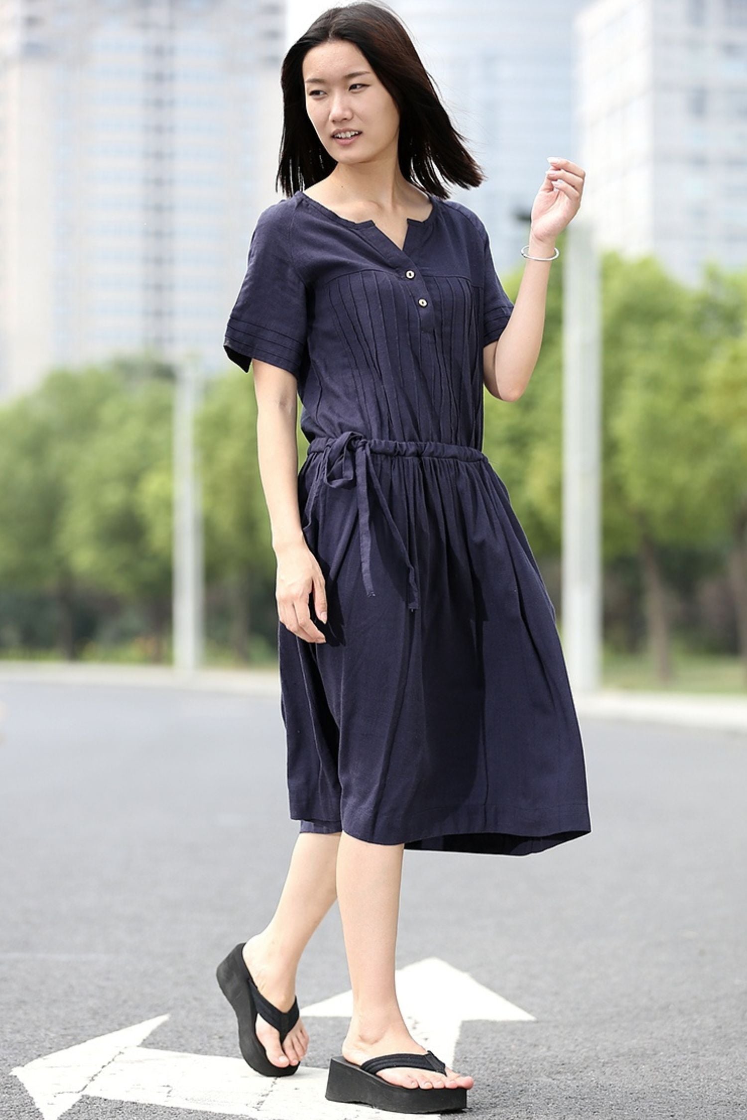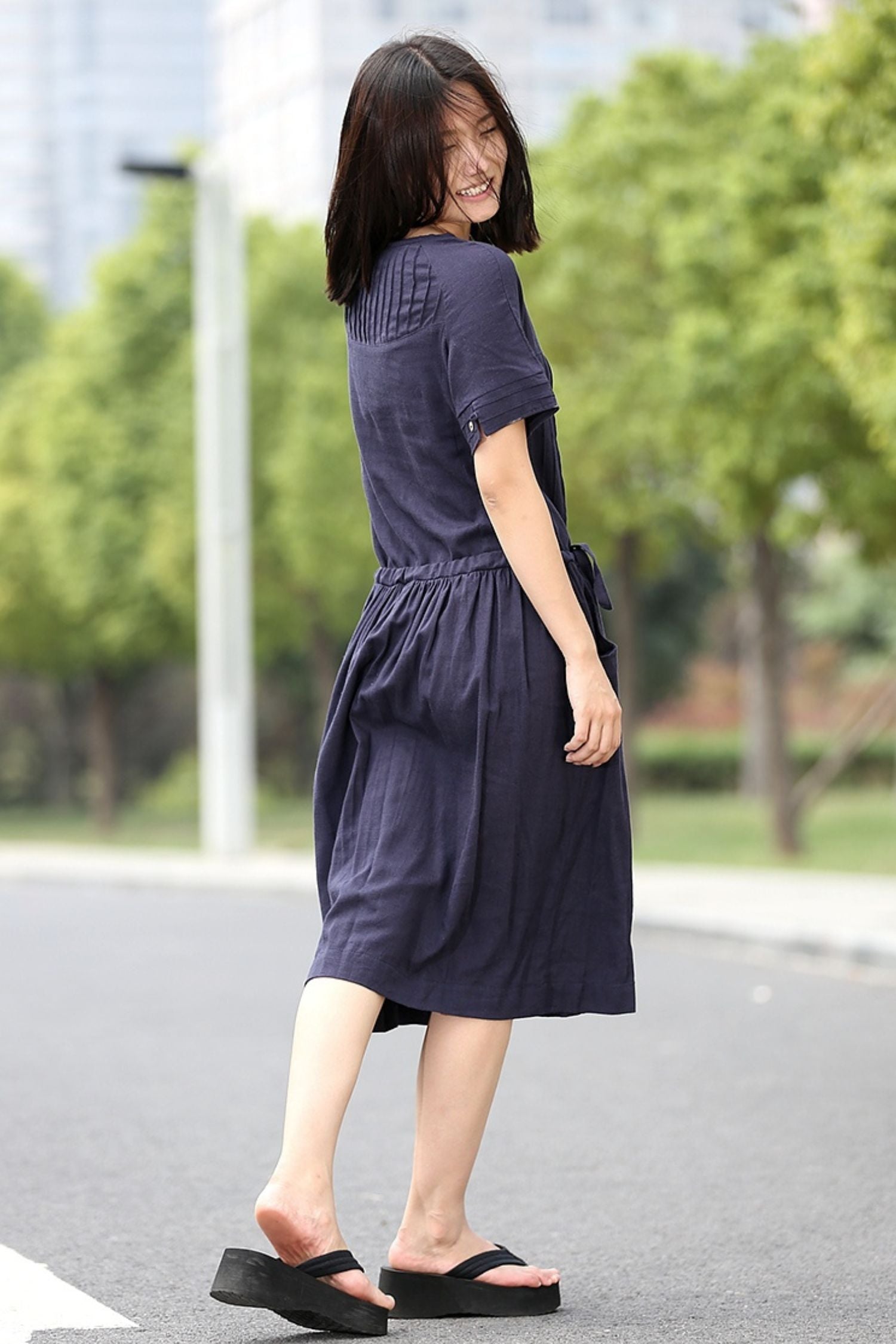 Casual Navy Blue Short-Sleeved Pleated Mid-Length Dress for Women C268