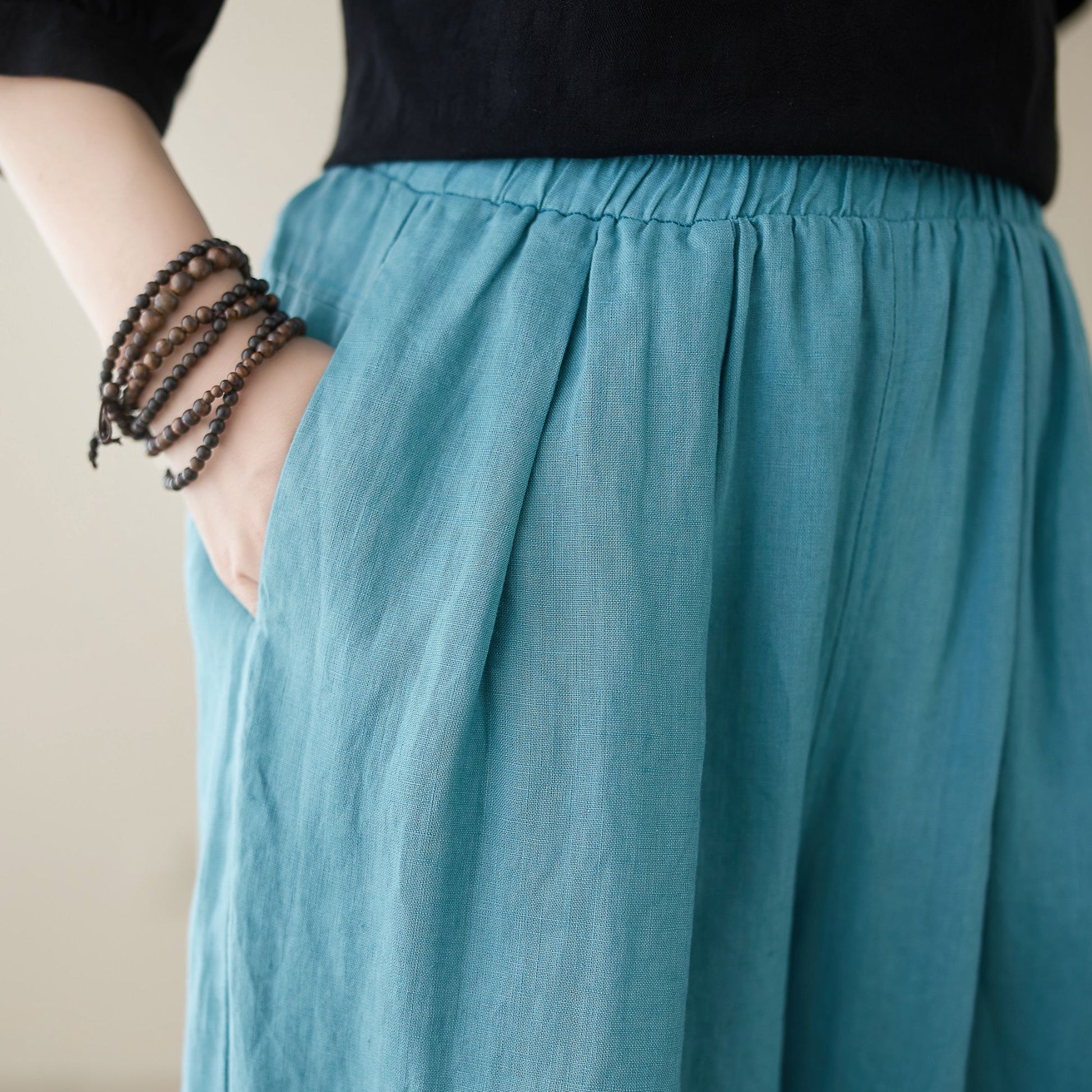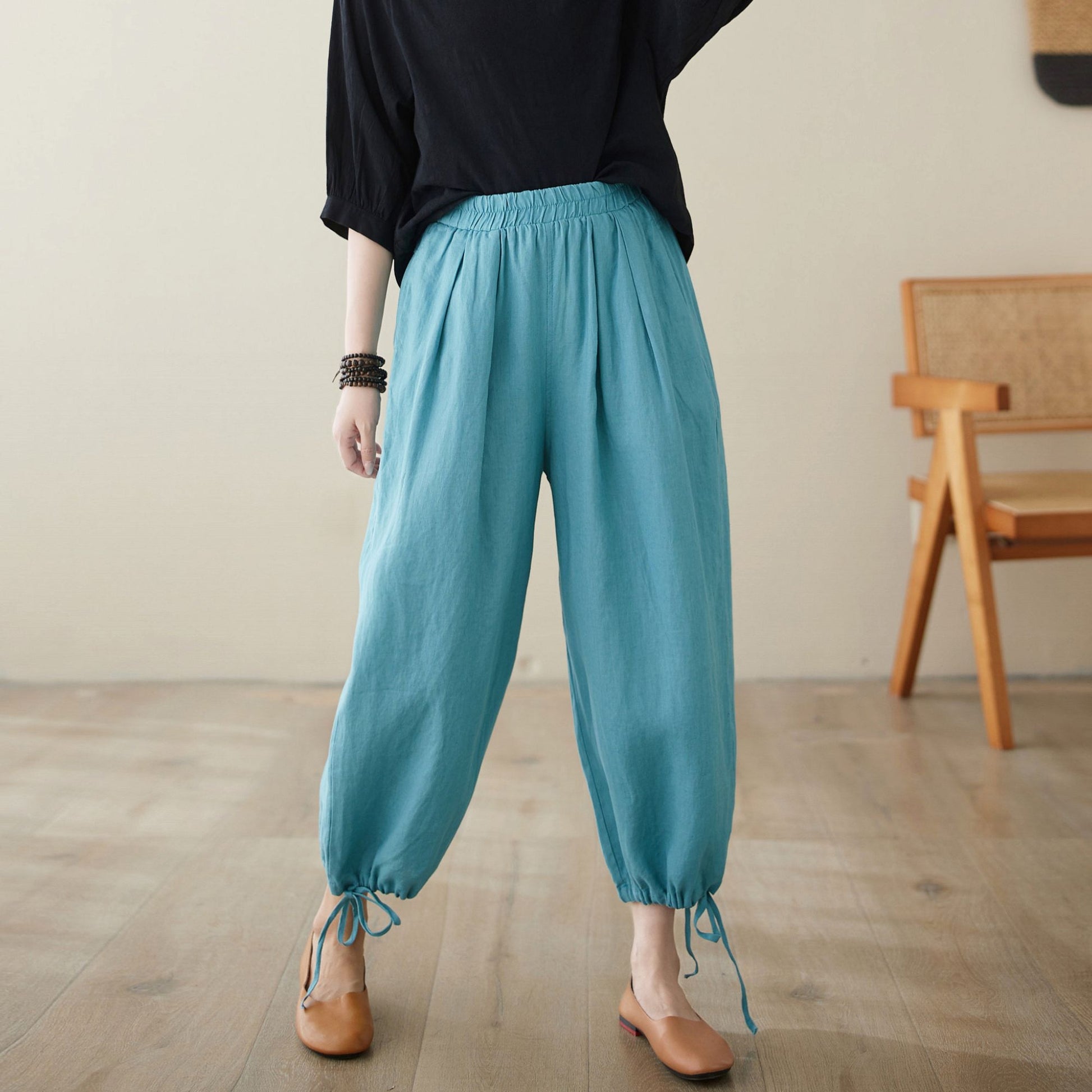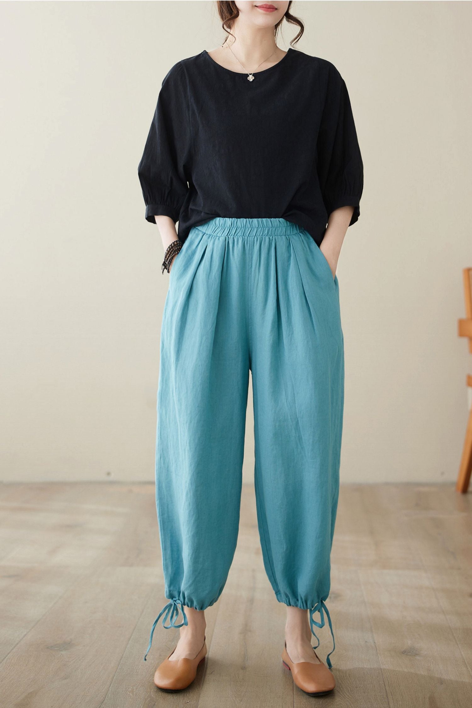 Indulge in luxurious comfort and style with our Blue elastic Waist casual linen pants C3965. These casual linen pants are the epitome of sophistication, featuring a loose fit and wide leg design for a flattering silhouette. The elastic waist and pockets add convenience to elevate your everyday look. Perfect for the spring season.