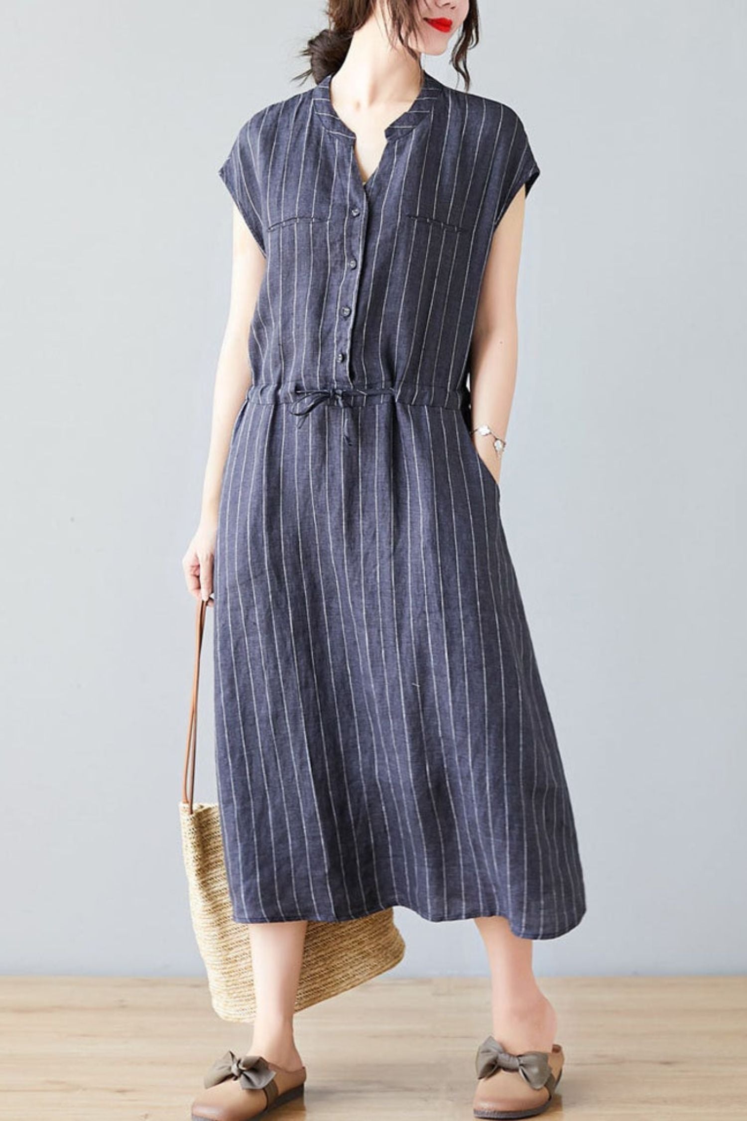 Striped Linen Sleeveless Loose Fit basic midi dress C1990