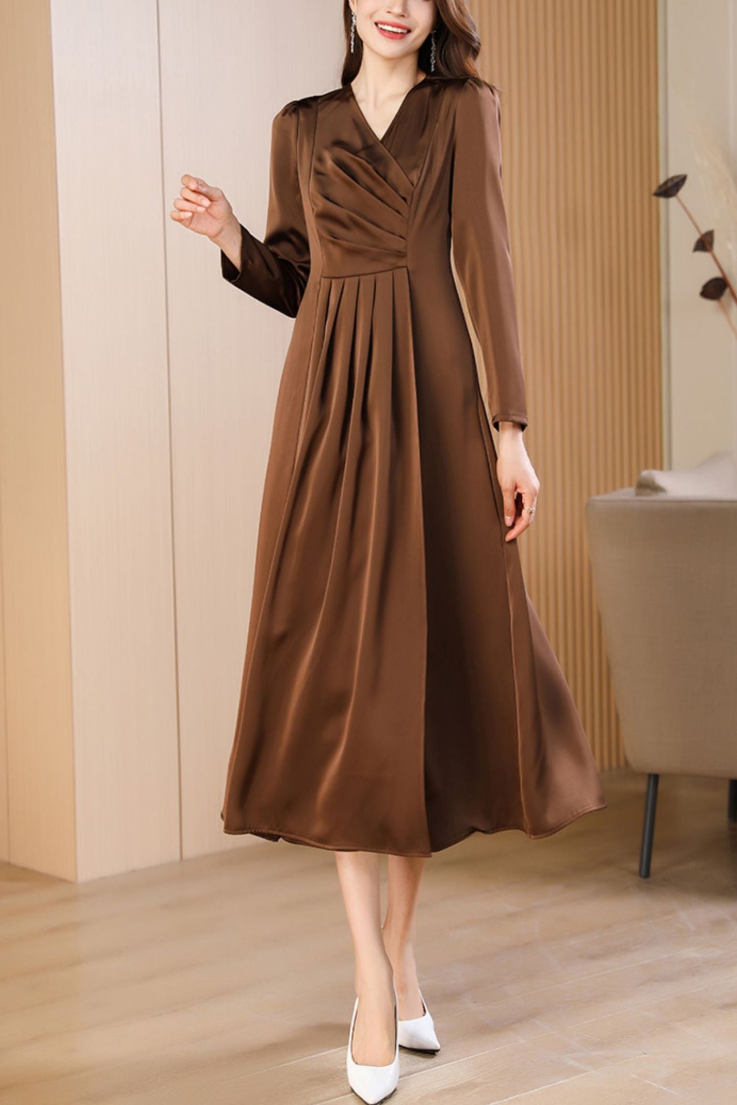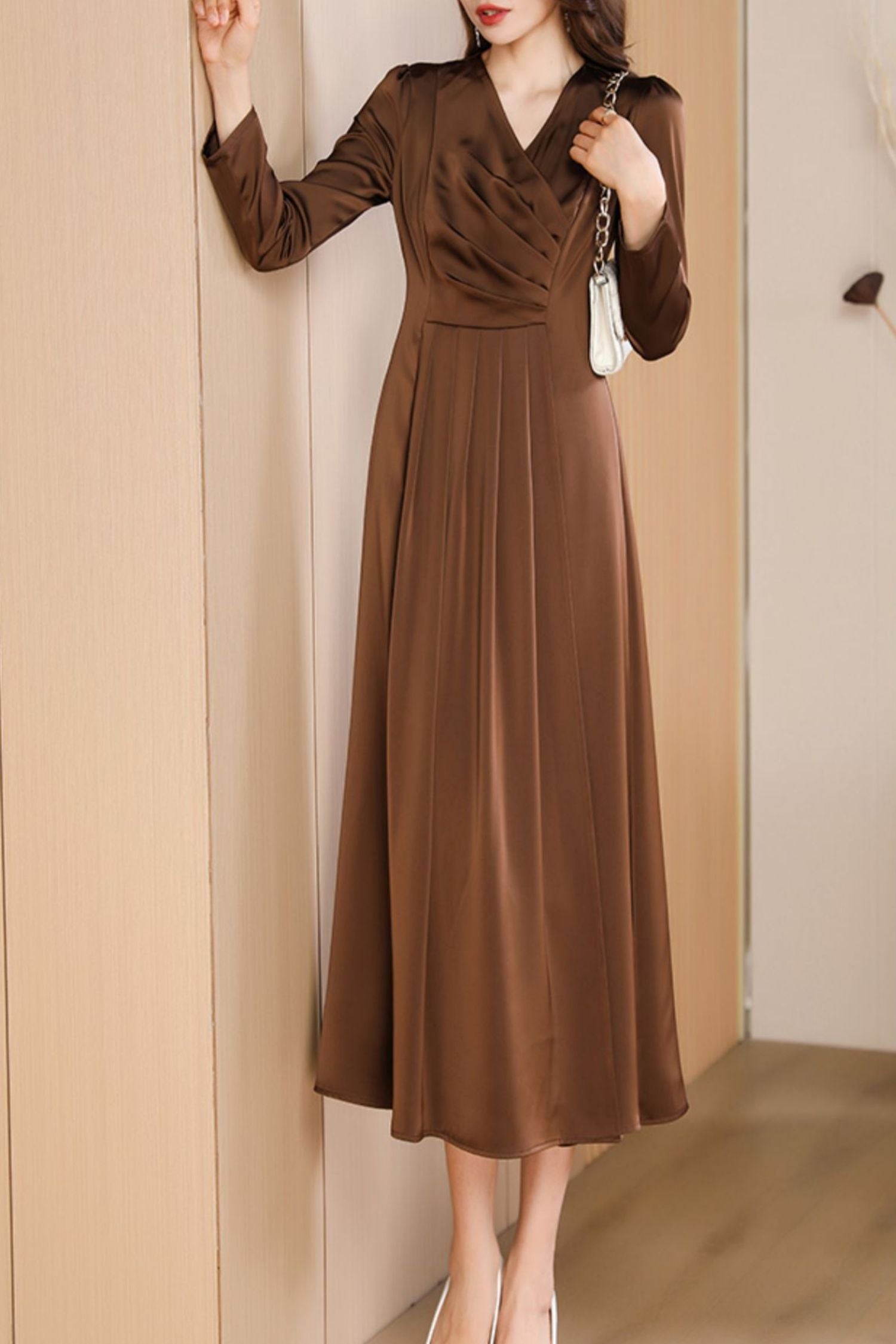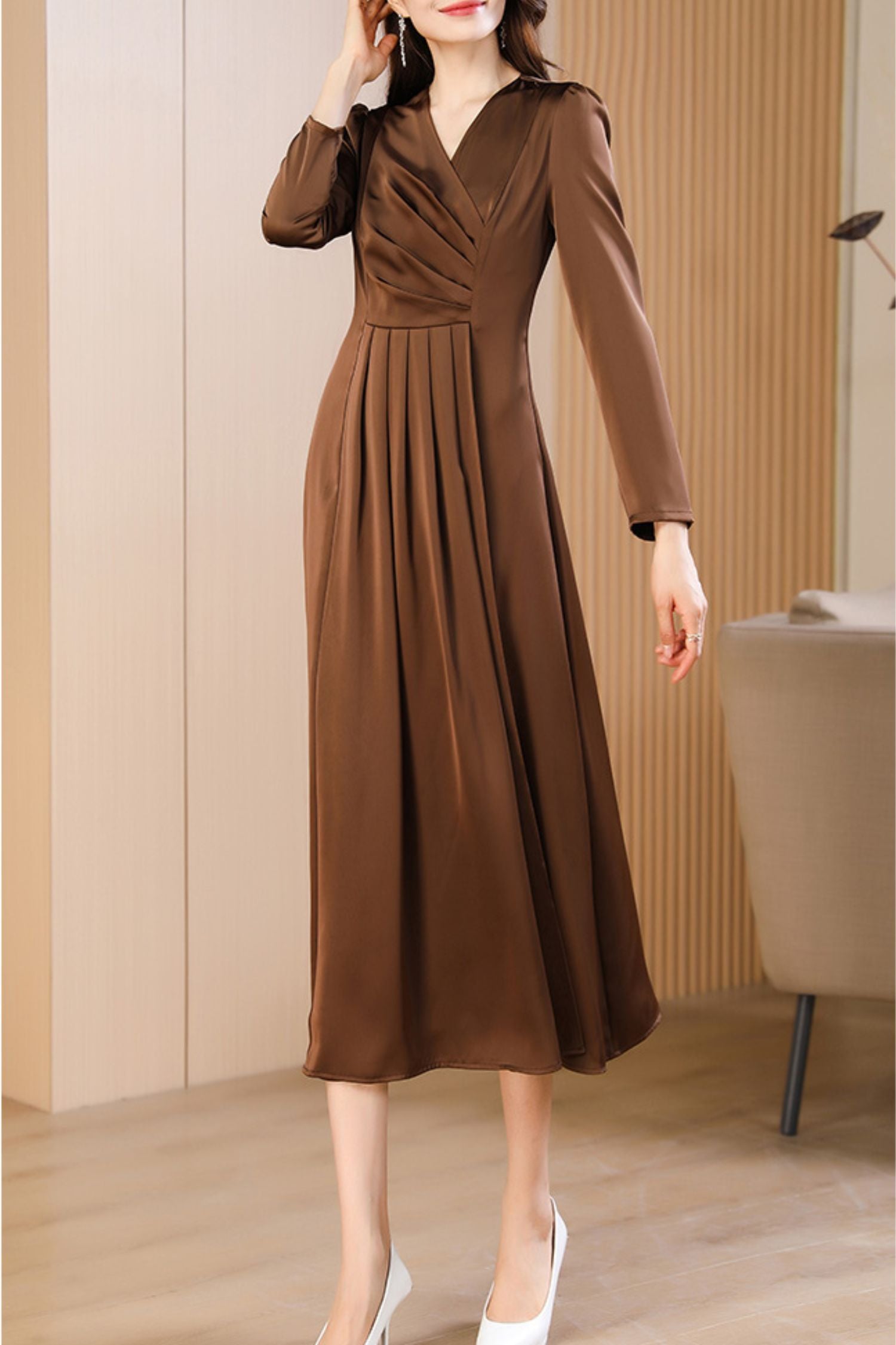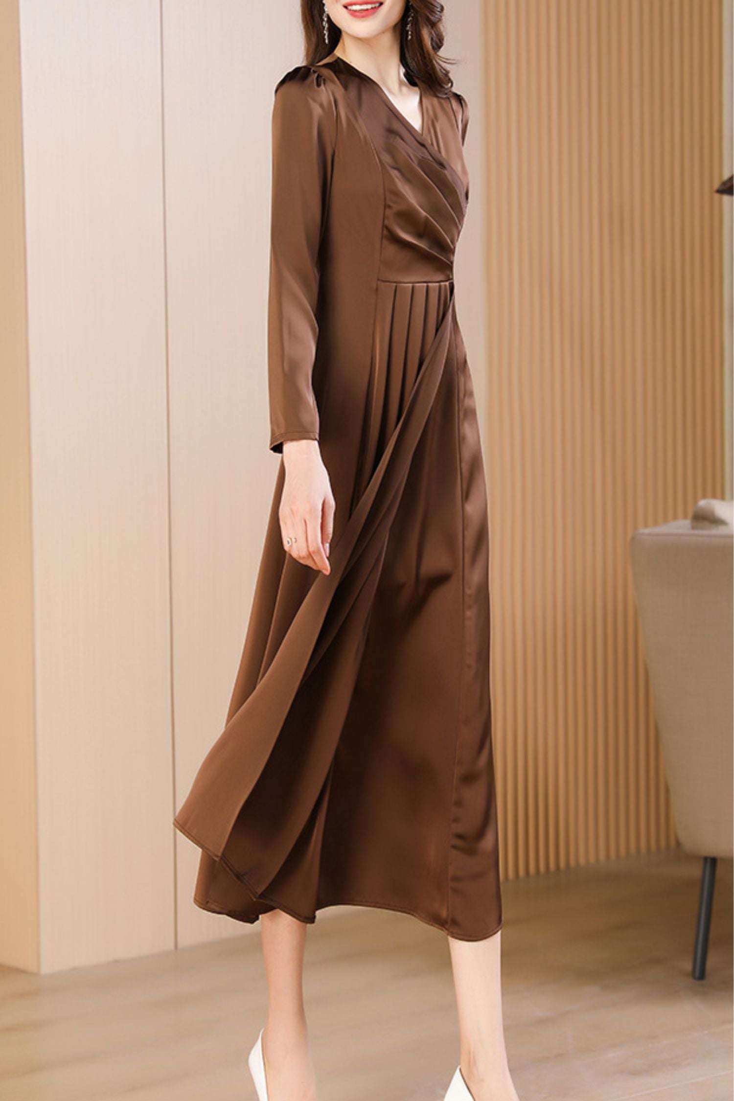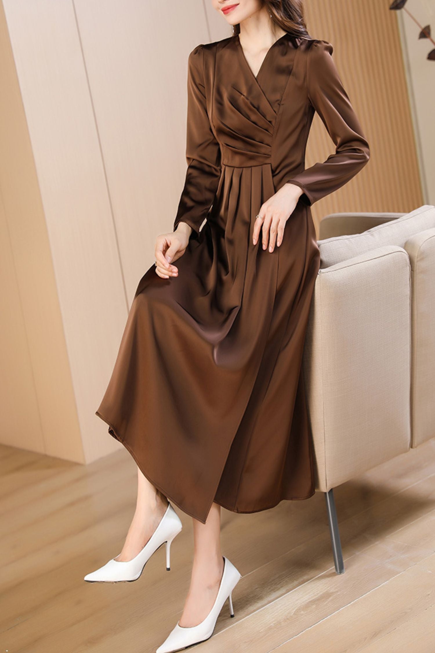 This luxurious, exclusive brown V-neck long dress is perfect for the spring and autumn seasons. Made with high-quality materials, it exudes elegance and sophistication. Its flattering V-neck silhouette flatters every figure while its long length adds a touch of drama. Elevate your style with this must-have dress.