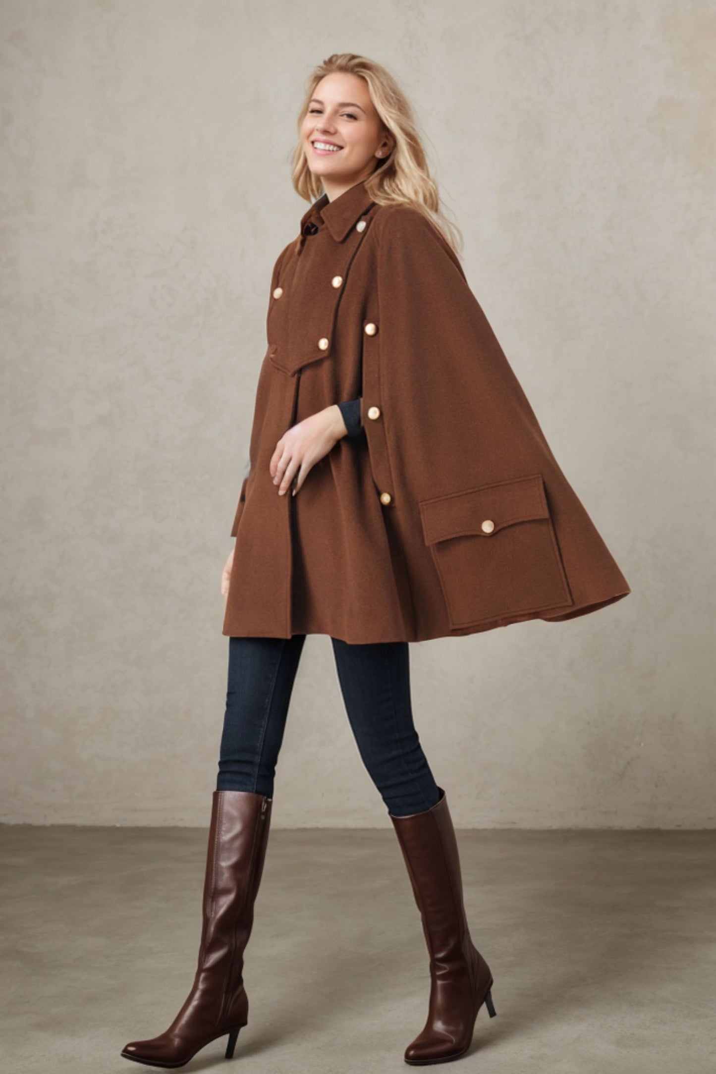Indulge in luxury with our Brown winter wool cape coat for women C3685. This elegant and exclusive coat is crafted from high-quality wool, keeping you warm and stylish all winter long. The rich brown color and cape design add a touch of sophistication to any outfit. Elevate your winter wardrobe today.