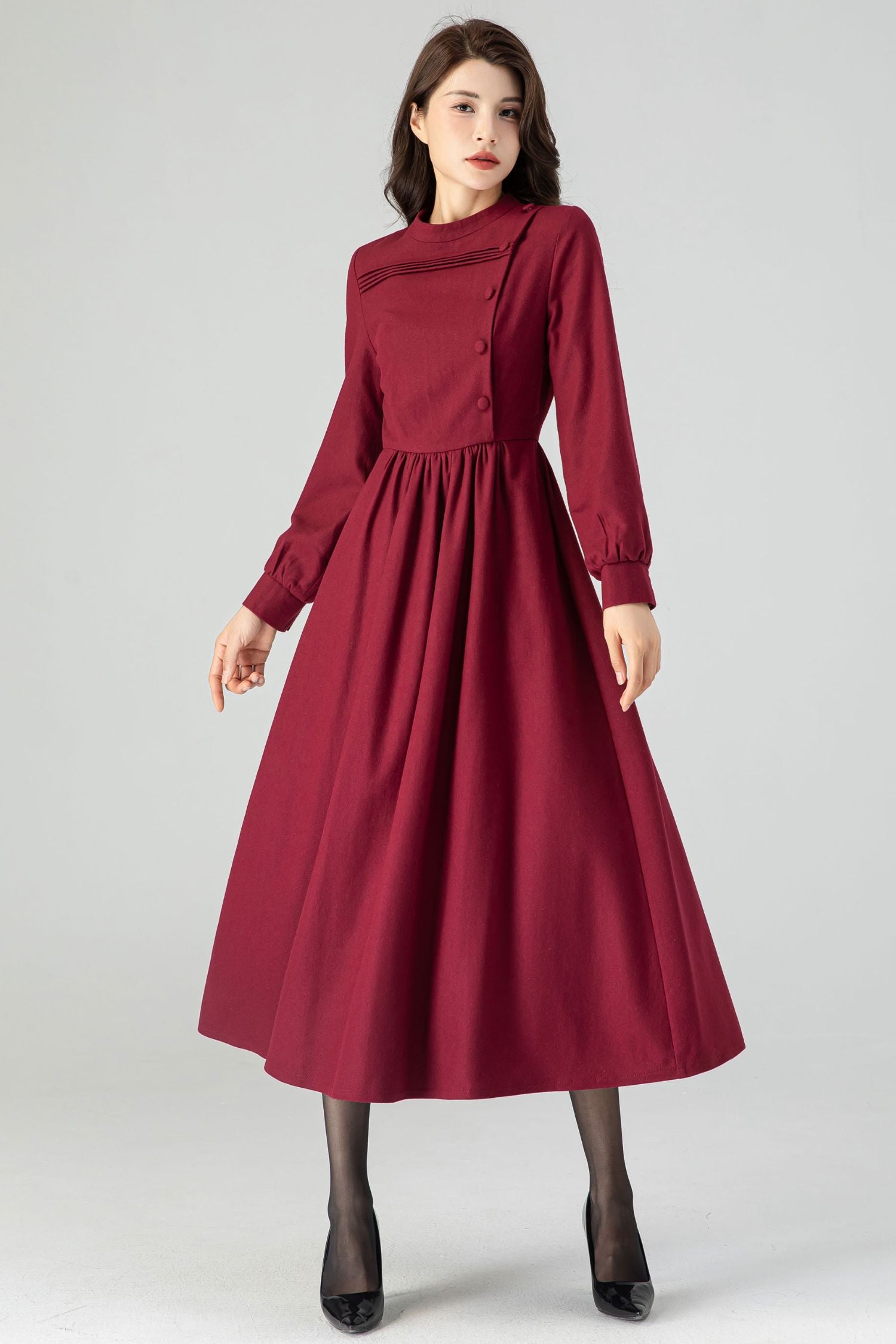 Indulge in luxurious winter style with our Burgundy Fit and Flare Dress C3608. This winter wool dress features a flattering fit and flare design and elegant pleats. The midi length and deep burgundy hue make it perfect for any occasion. Available in plus size for all women to enjoy.