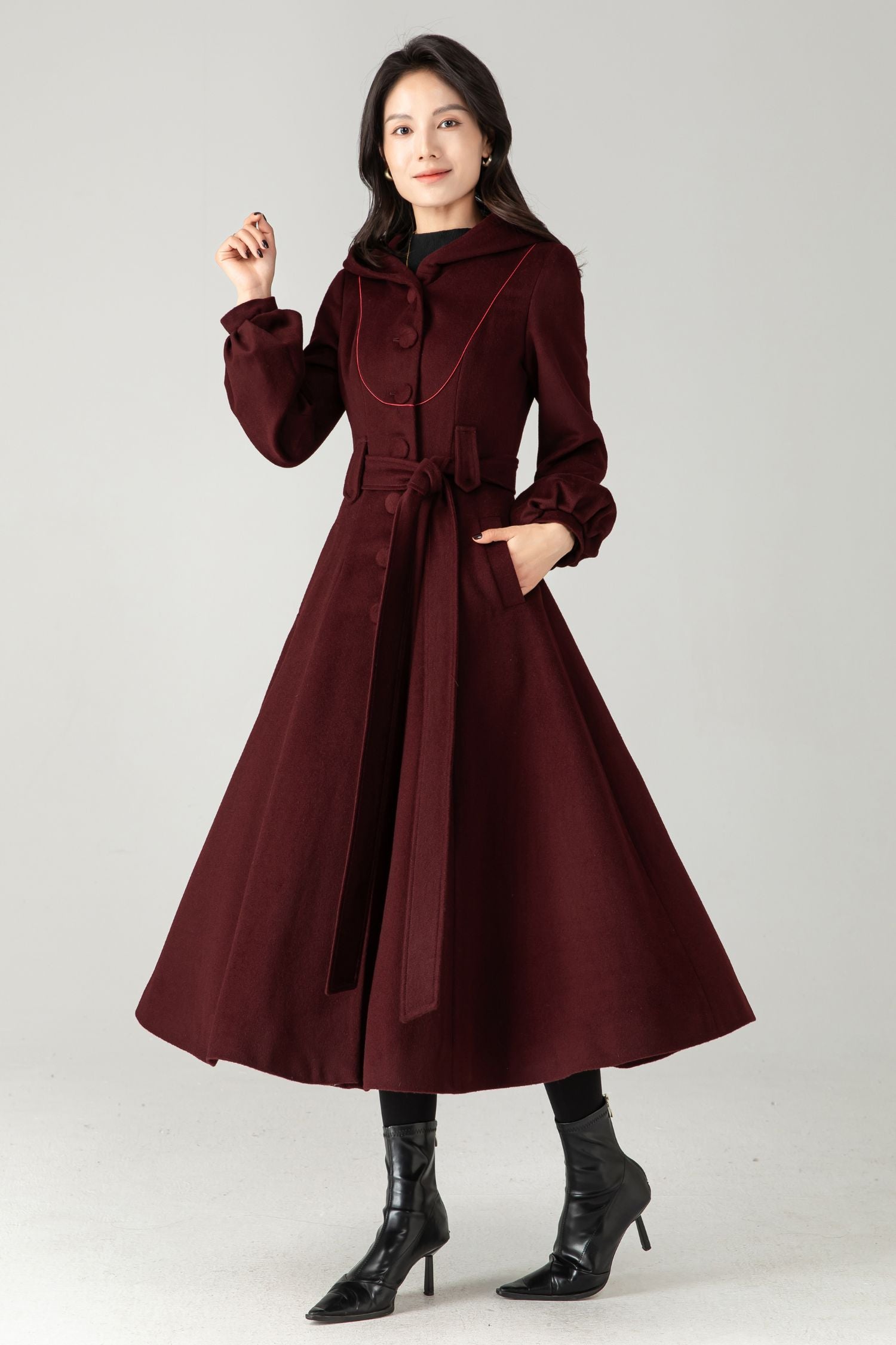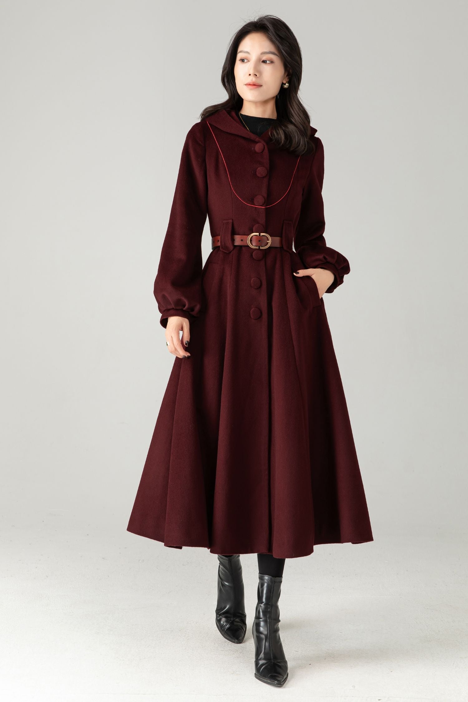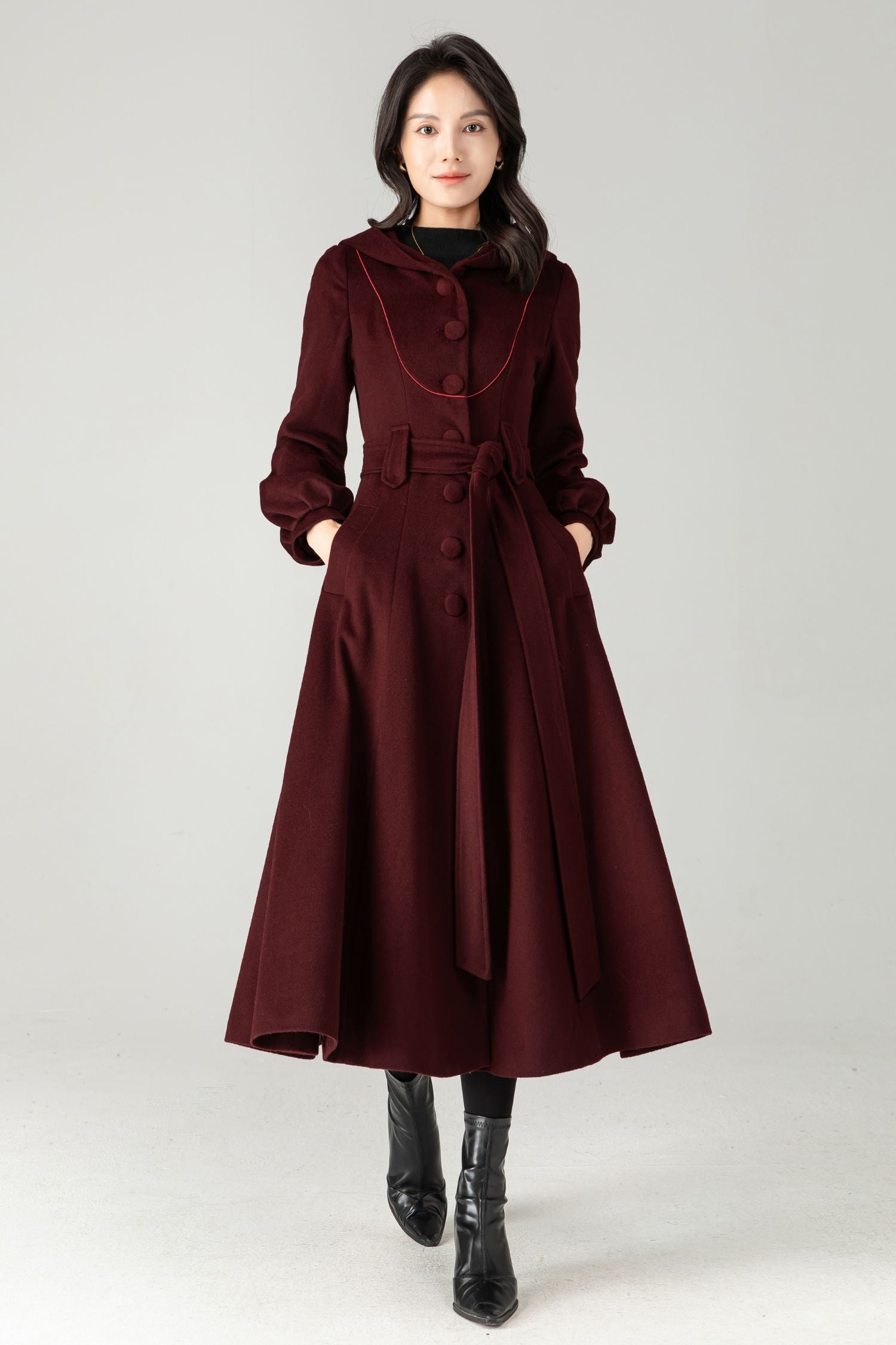 Burgundy Wool Blend Hooded Coat: Retro Belted A-Line Long Winter Coat C5343