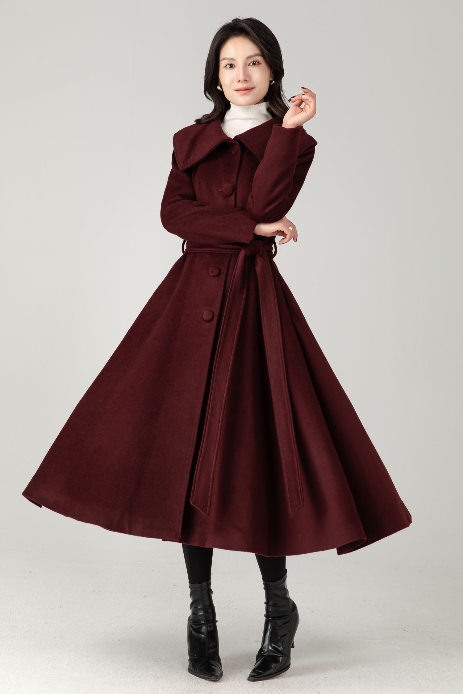 This burgundy wool-blend midi coat blends a dramatic wide collar with a graceful A-line swing shape. The belt defines the waist, while the soft lining and structured design offer a warm, timeless winter look.