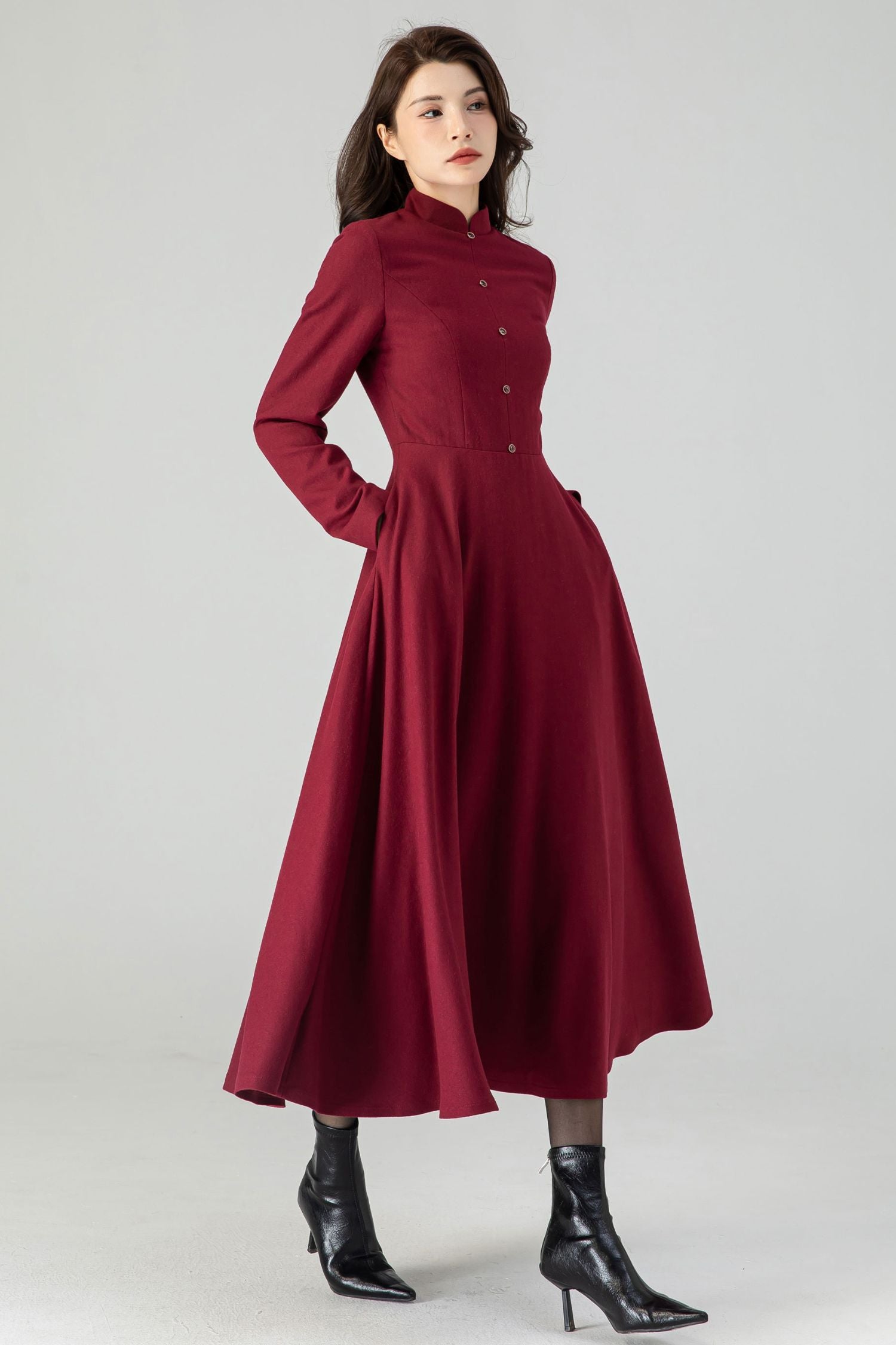 Indulge in luxury with our Burgundy Wool Fit and Flare Dress. Made with high-quality wool, this dress features a flattering fit and flare silhouette and a button front design. Complete with pockets, this dress is not only stylish but also functional. Perfect for autumn, this dress exudes elegance and sophistication.