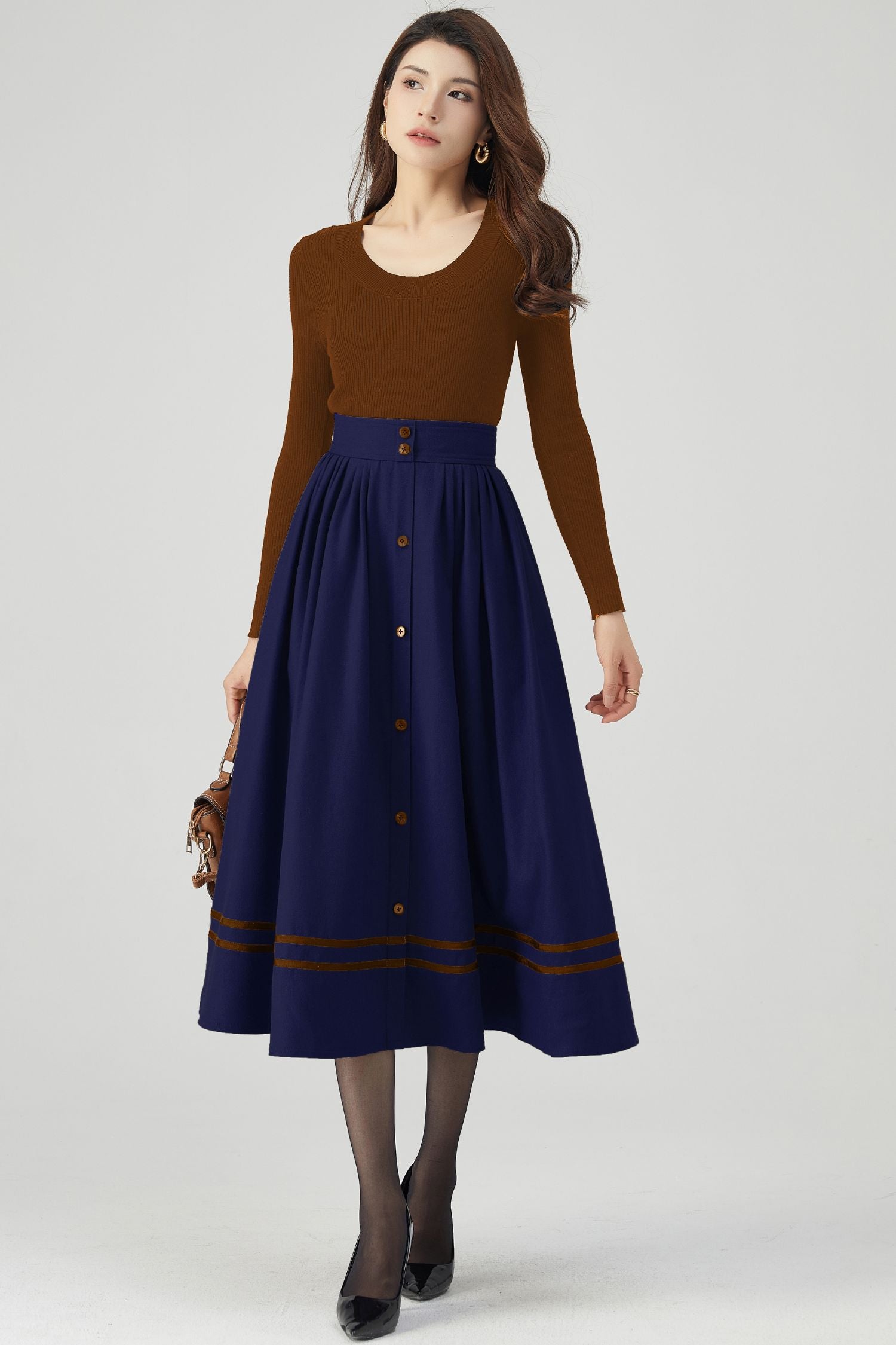 This handmade Button Wool Skirt exudes luxurious winter warmth. Crafted from high-quality wool, this Midi Skirt features a timeless button-down design and a flattering high waist. The Swing Skirt style adds a touch of sophistication to any outfit, making it a must-have for stylish women.