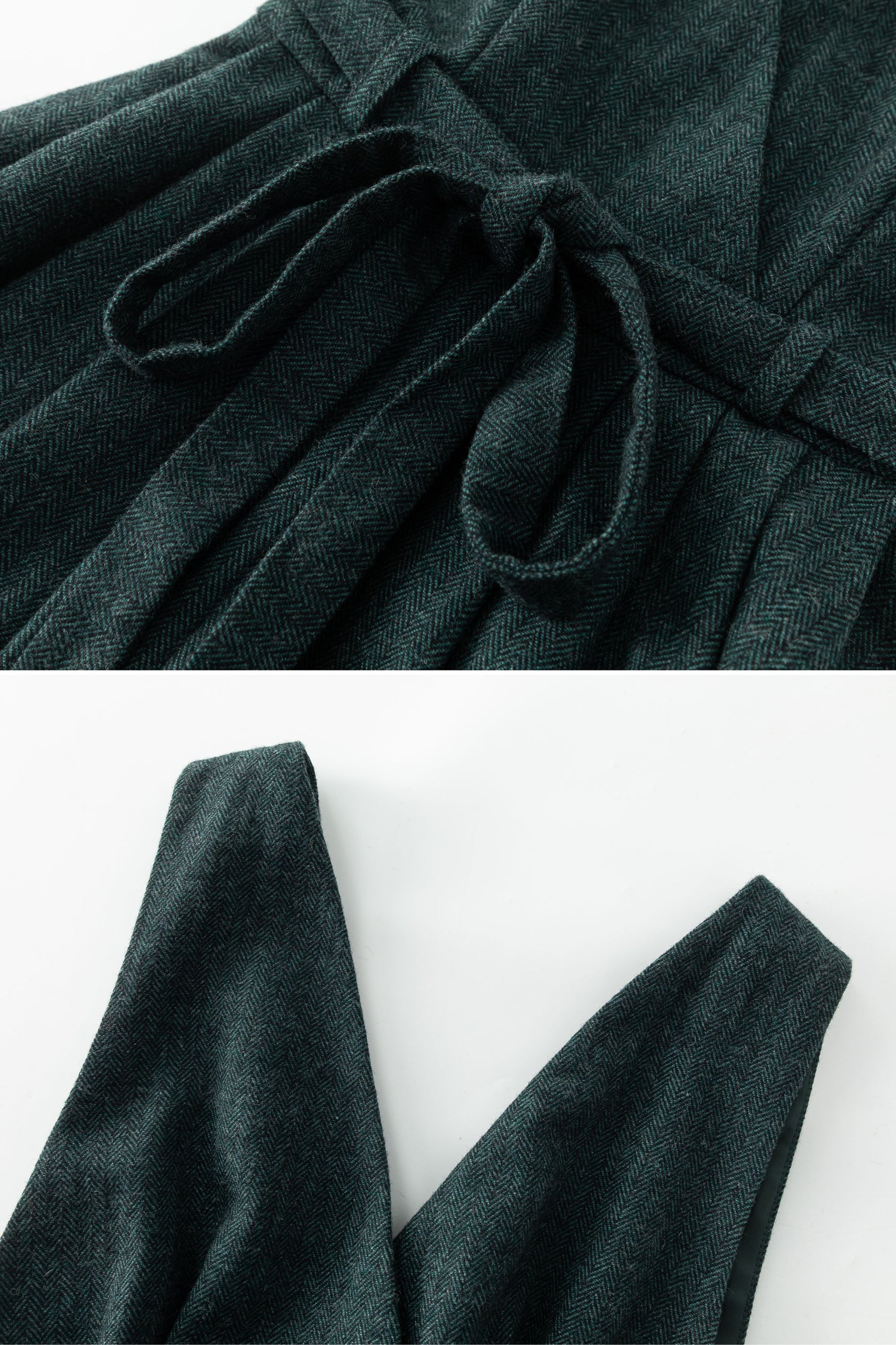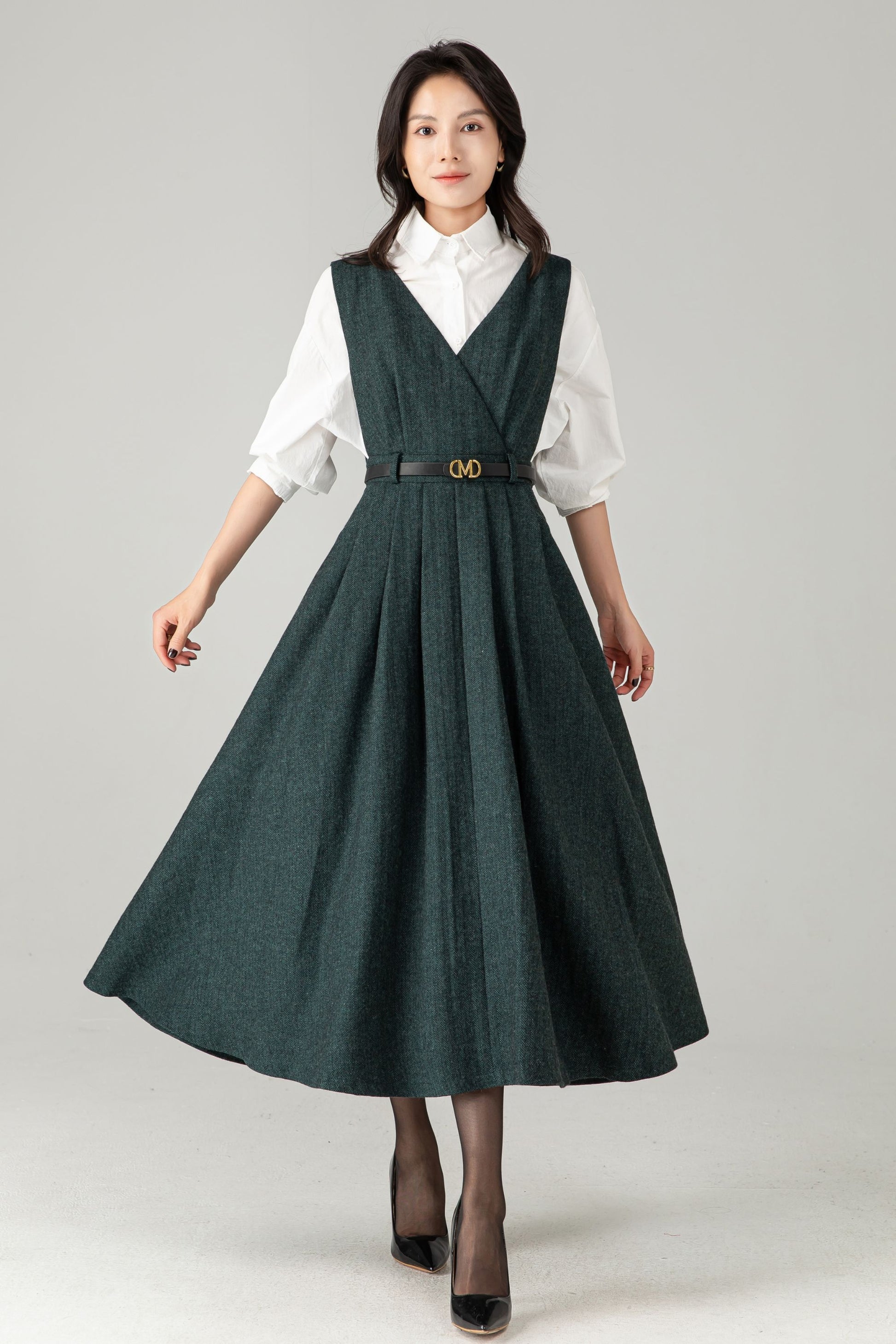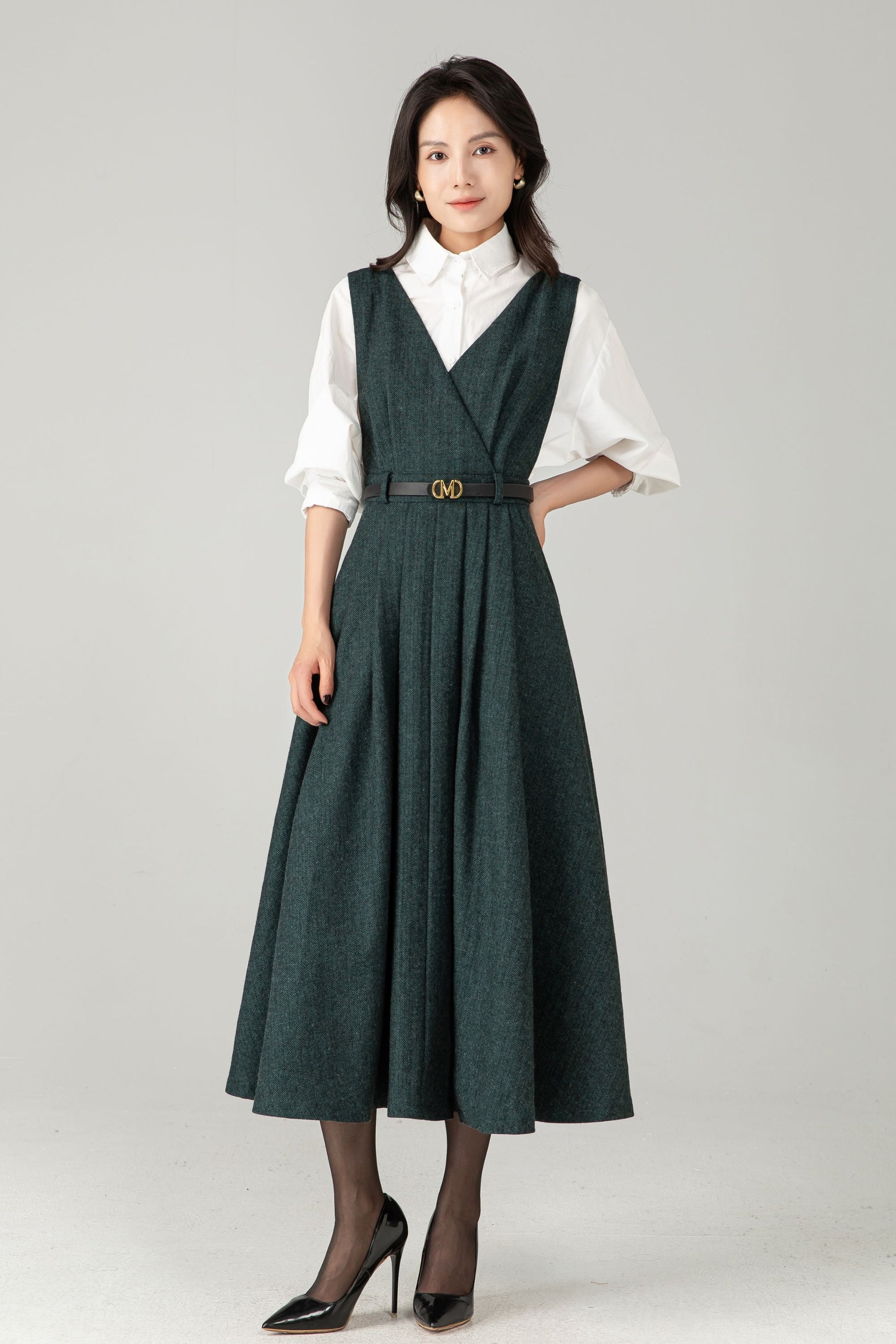 Dark Green Wool Blend Midi Pinafore Dress for Women – Sleeveless V-Neck Winter Jumper with Belt, Ylistyle C5339