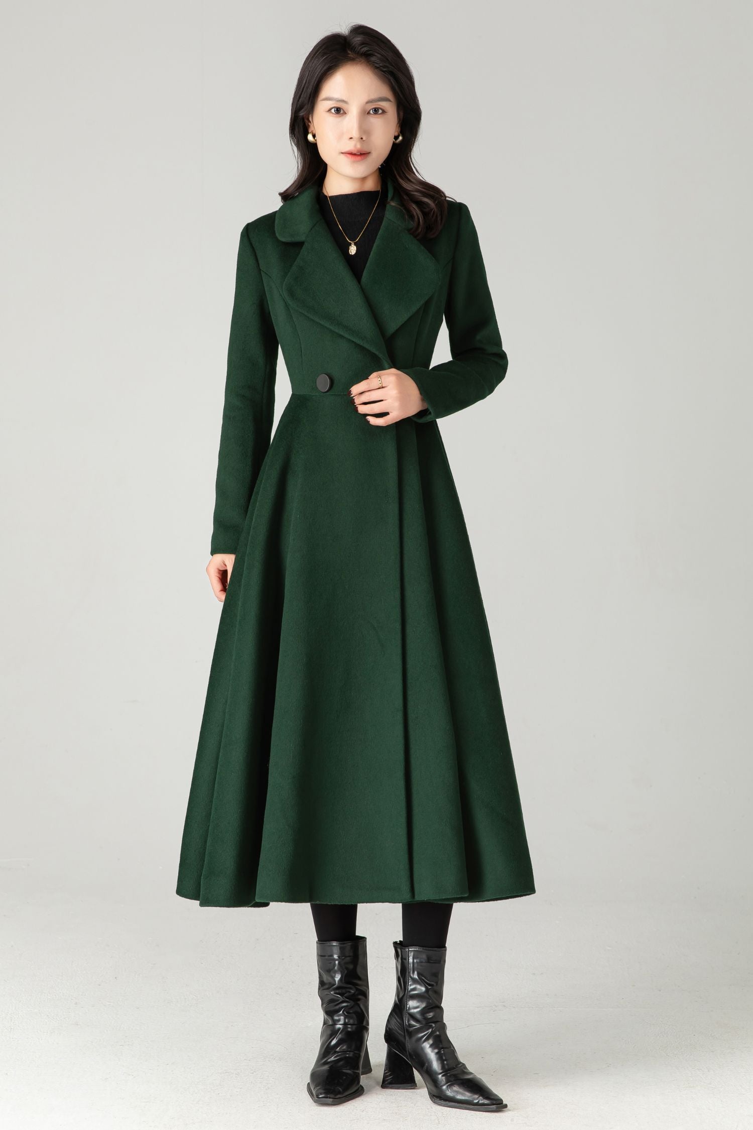 This emerald green wool coat is a timeless piece for your closet. With its tailored double-breasted design, elegant wide lapel, and flowy flared midi cut, it brings a touch of retro glamour to your cold-weather looks.