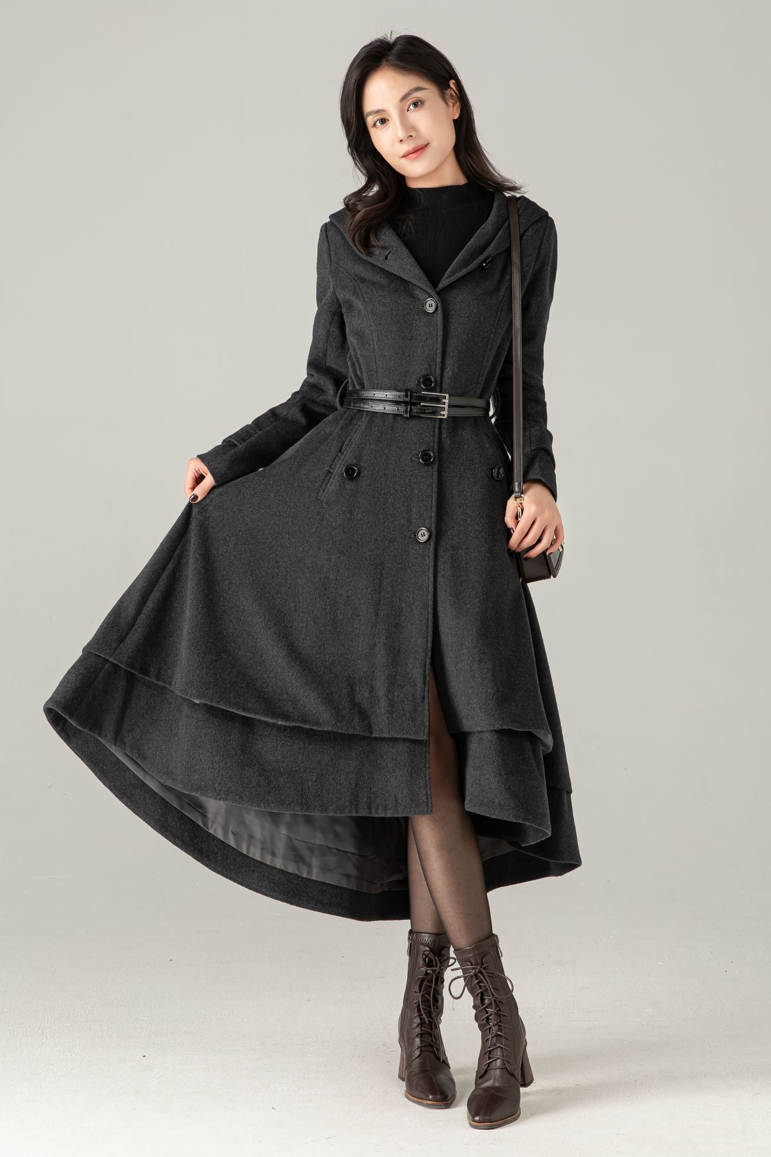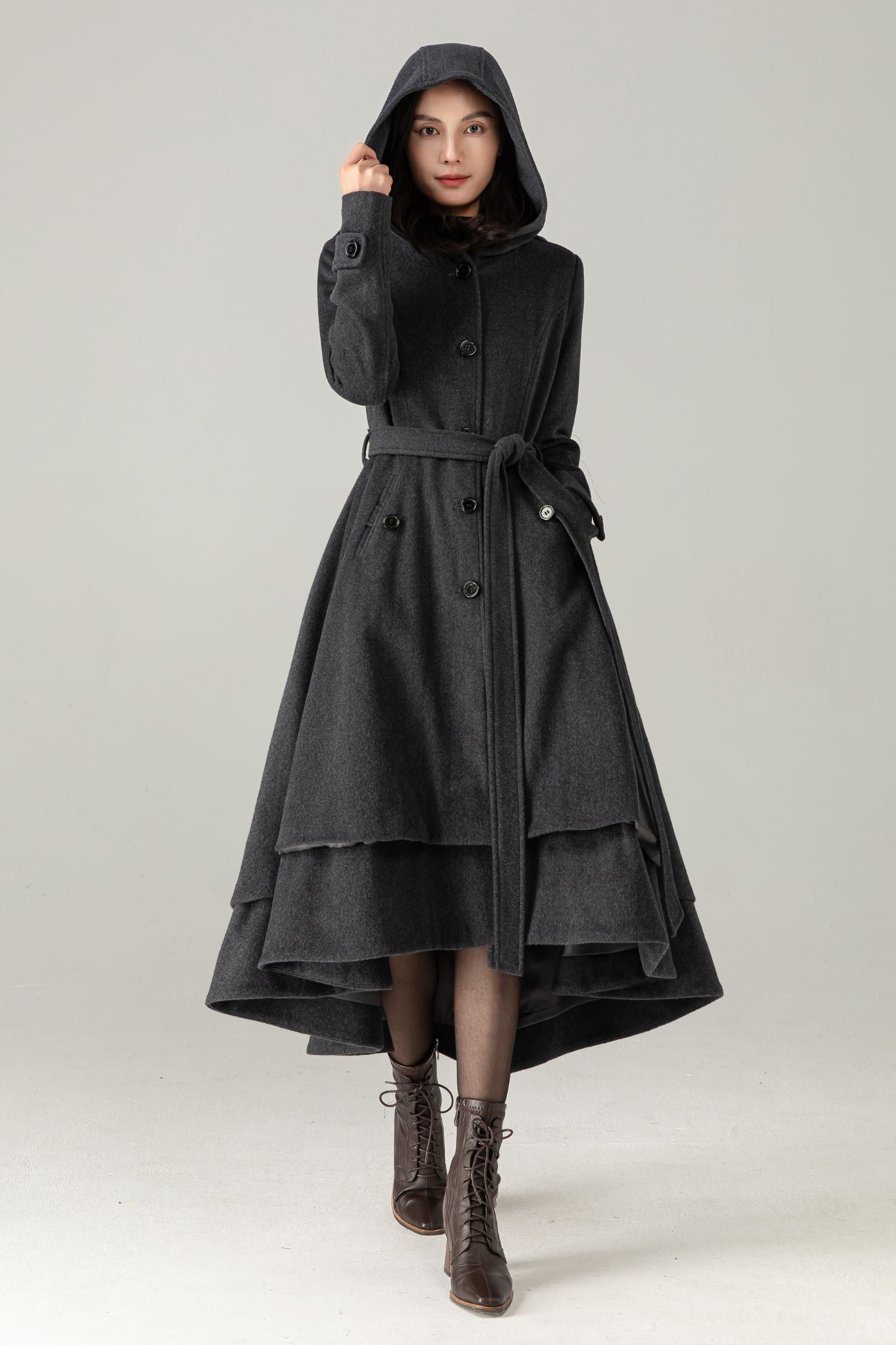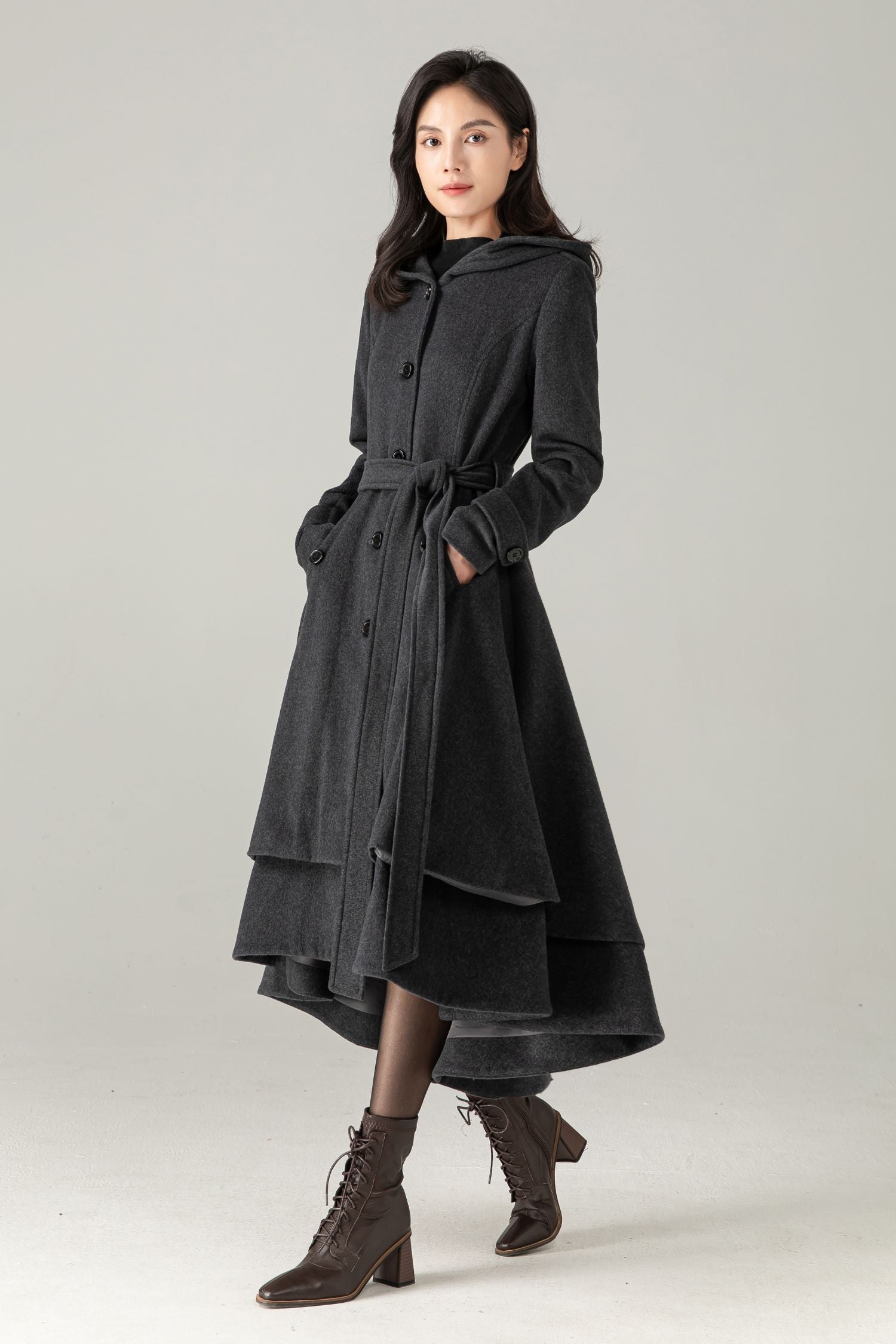 Gray Hooded Wool Blend Coat: Belted High-Low Maxi Swing Winter Overcoat, Ylistyle C5374