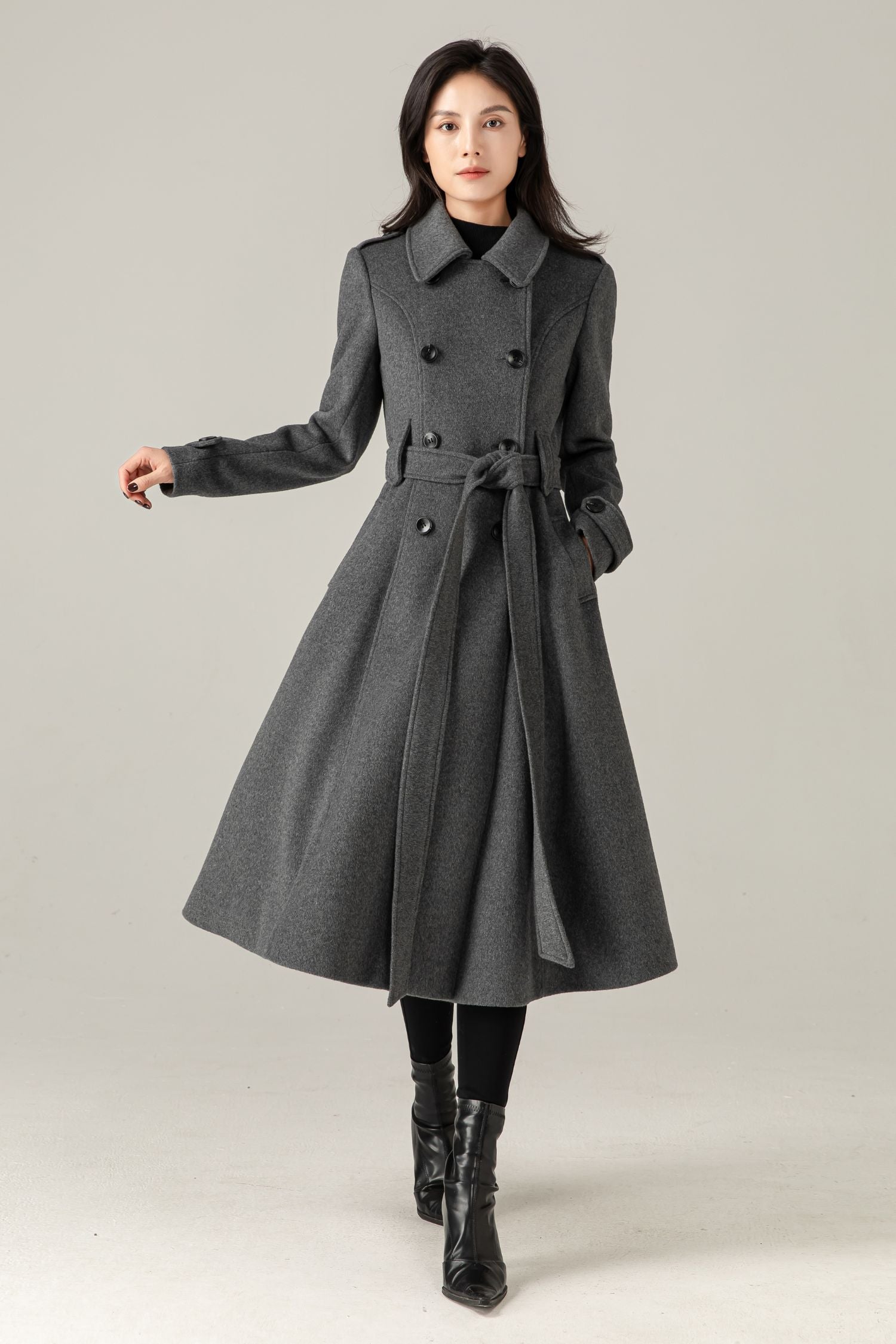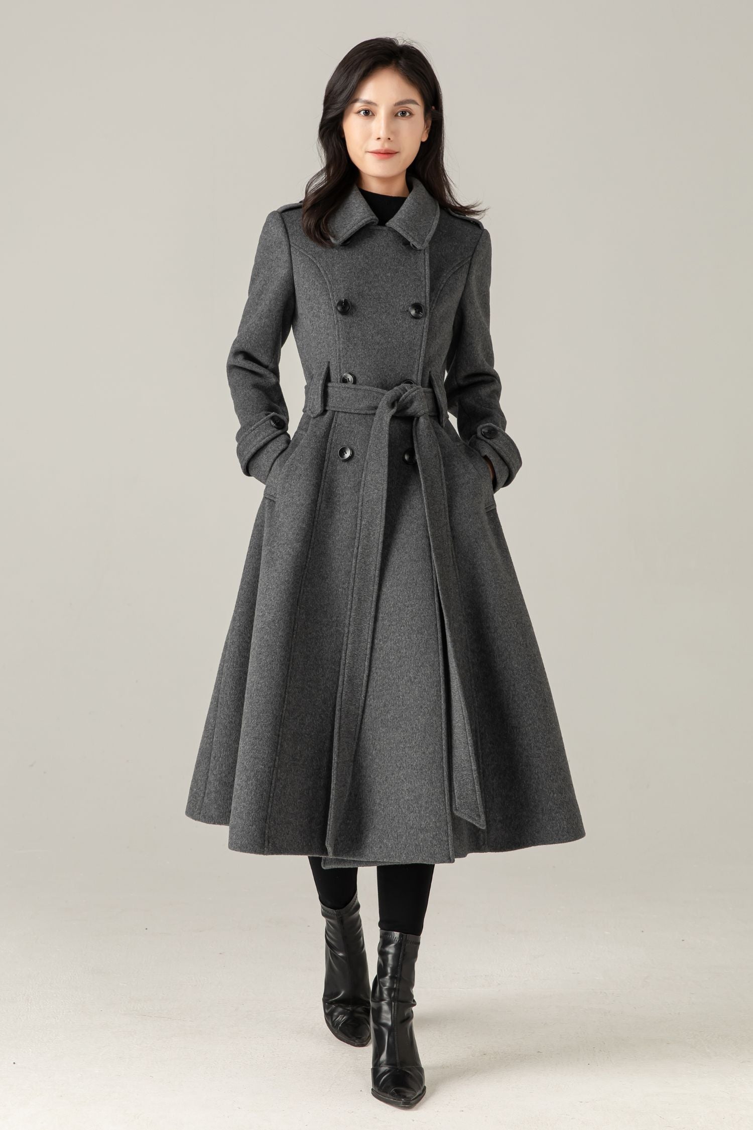 Gray Wool Blend Swing Coat: Double Breasted Belted Maxi Winter Overcoat, Ylistyle C5376