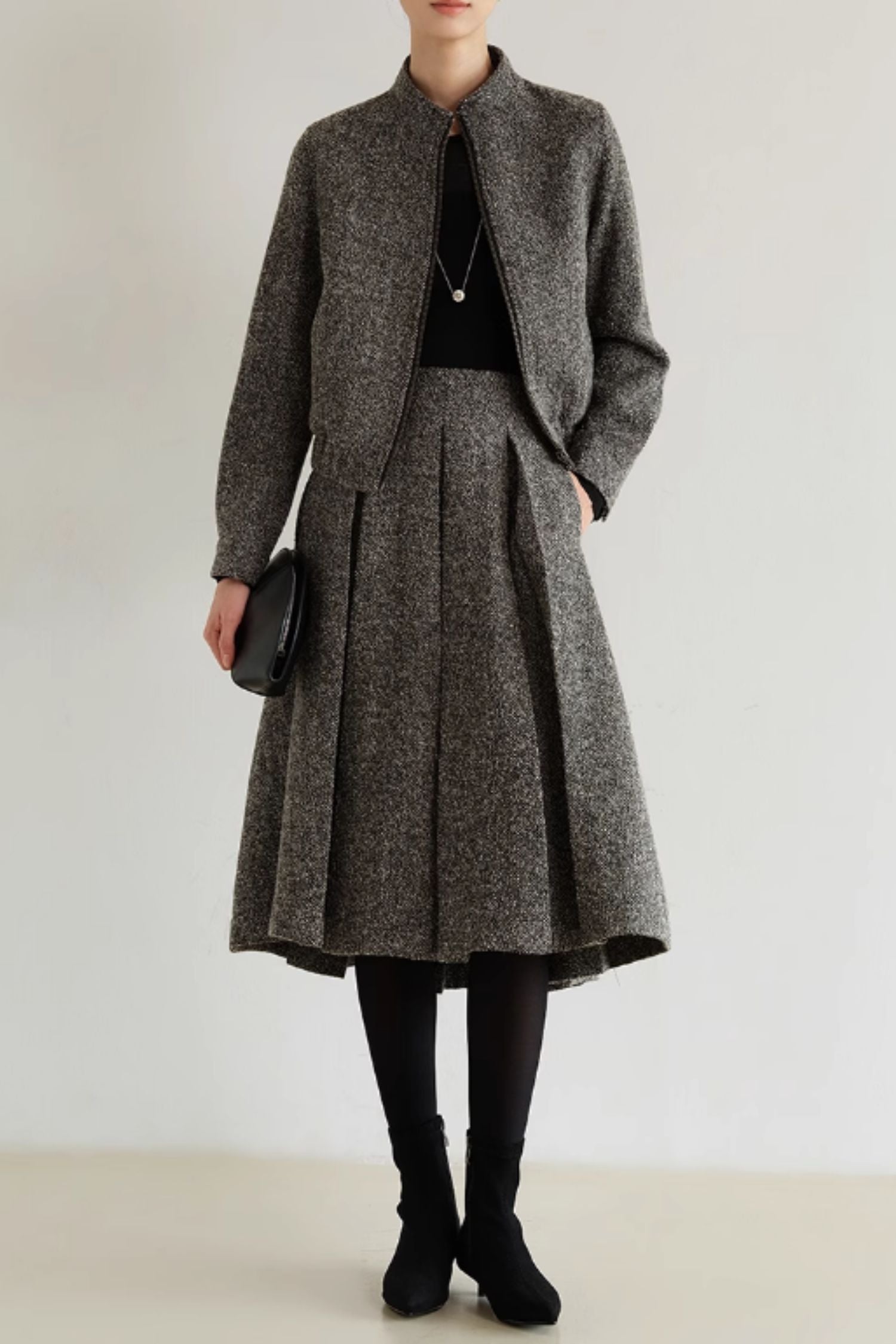 Elevate your wardrobe with this sophisticated gray wool set, featuring a tailored jacket paired with a coordinating wool skirt. The premium wool construction delivers timeless elegance and exceptional durability, while the neutral gray tone seamlessly transitions from office to evening occasions. This versatile two-piece ensemble offers effortless styling—wear together for a polished, put-together look or mix and match with existing pieces. Perfect for professionals seeking refined, investment-worthy basics that combine comfort with understated luxury.