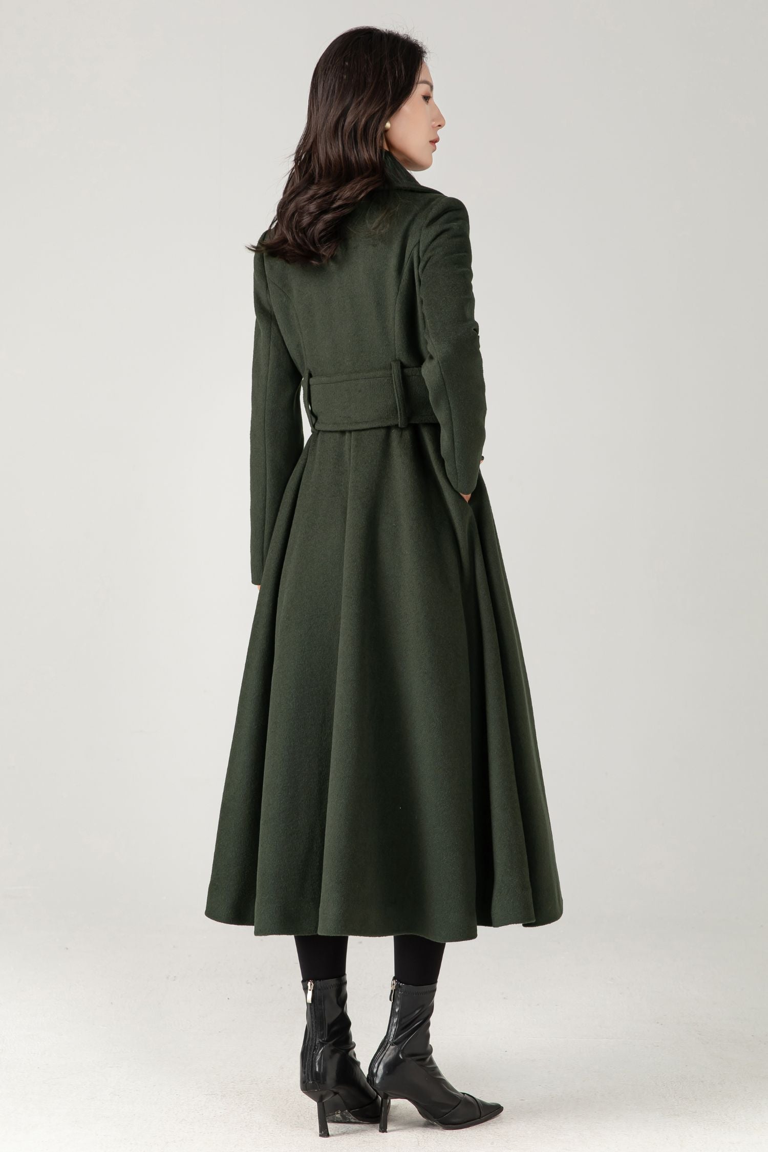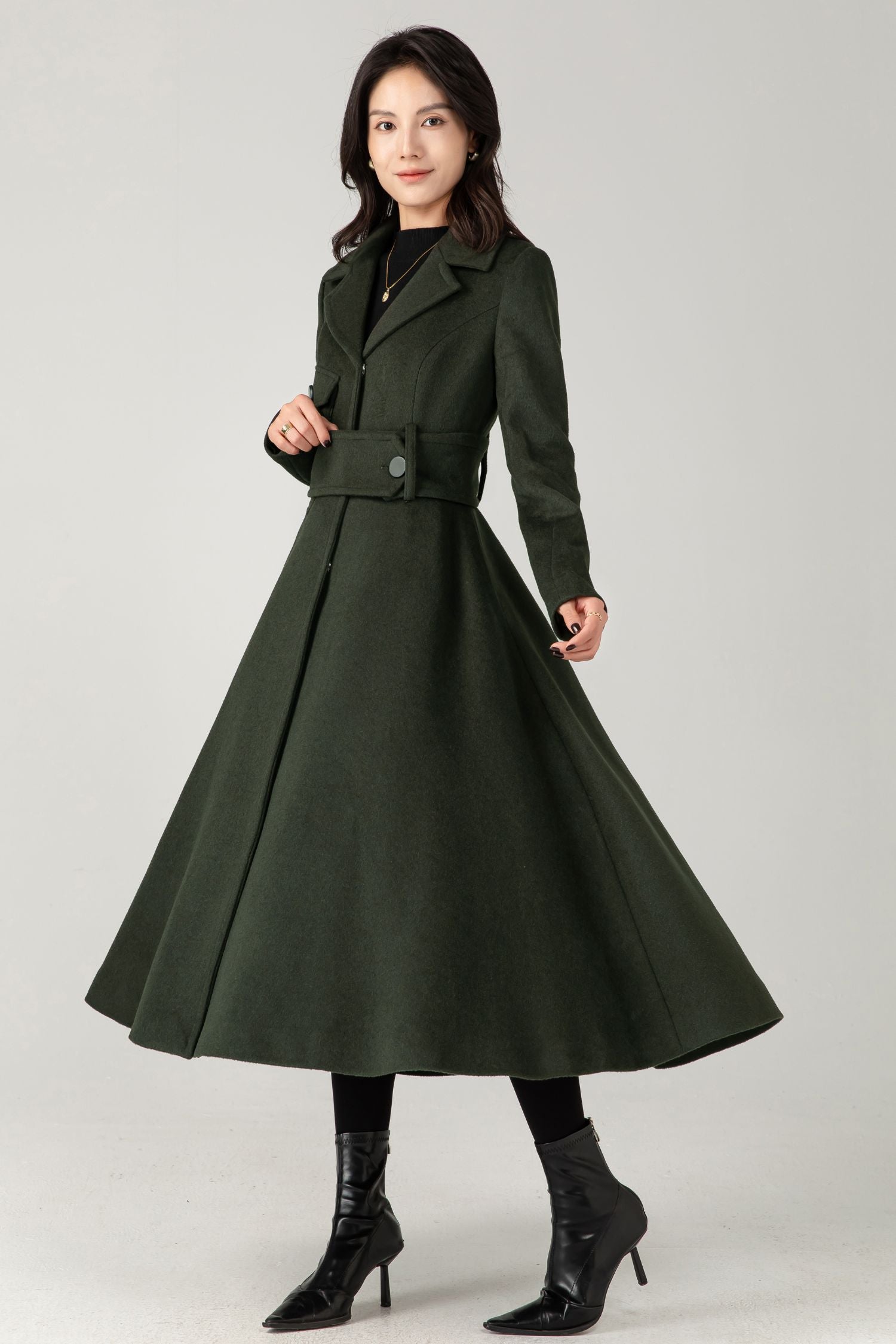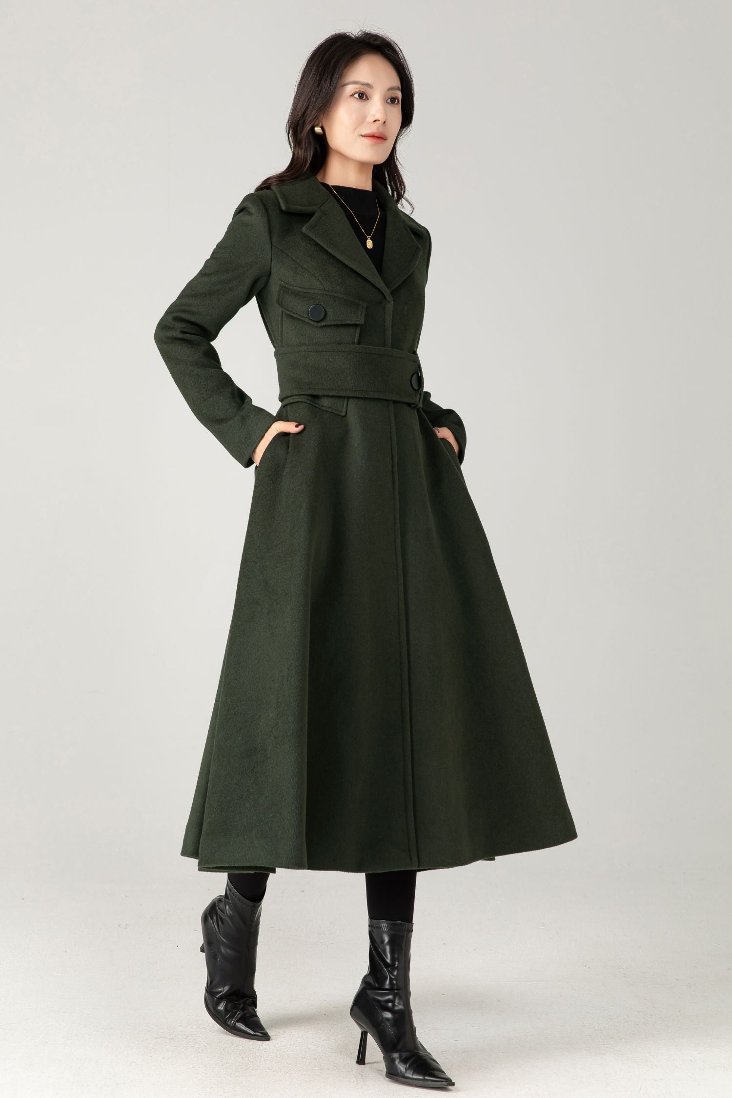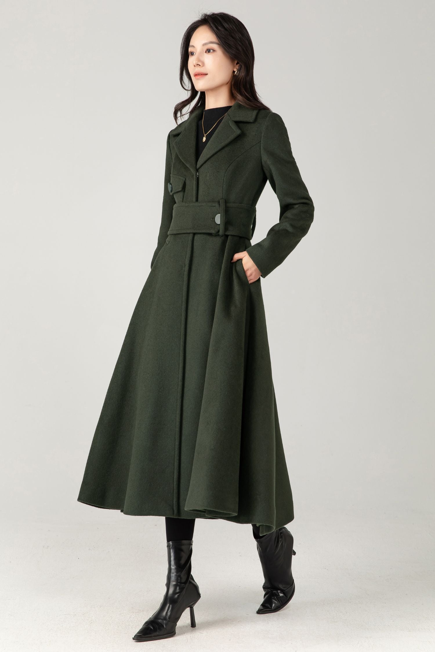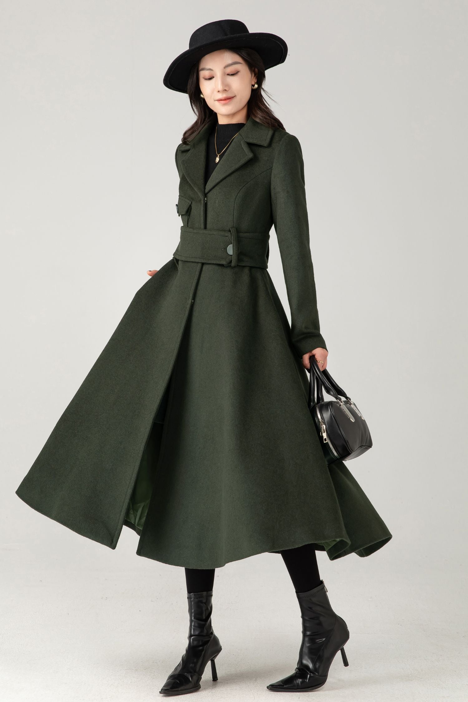 Green Wool Coat: Women’s Tailored Belted A-Line Winter Overcoa C5336