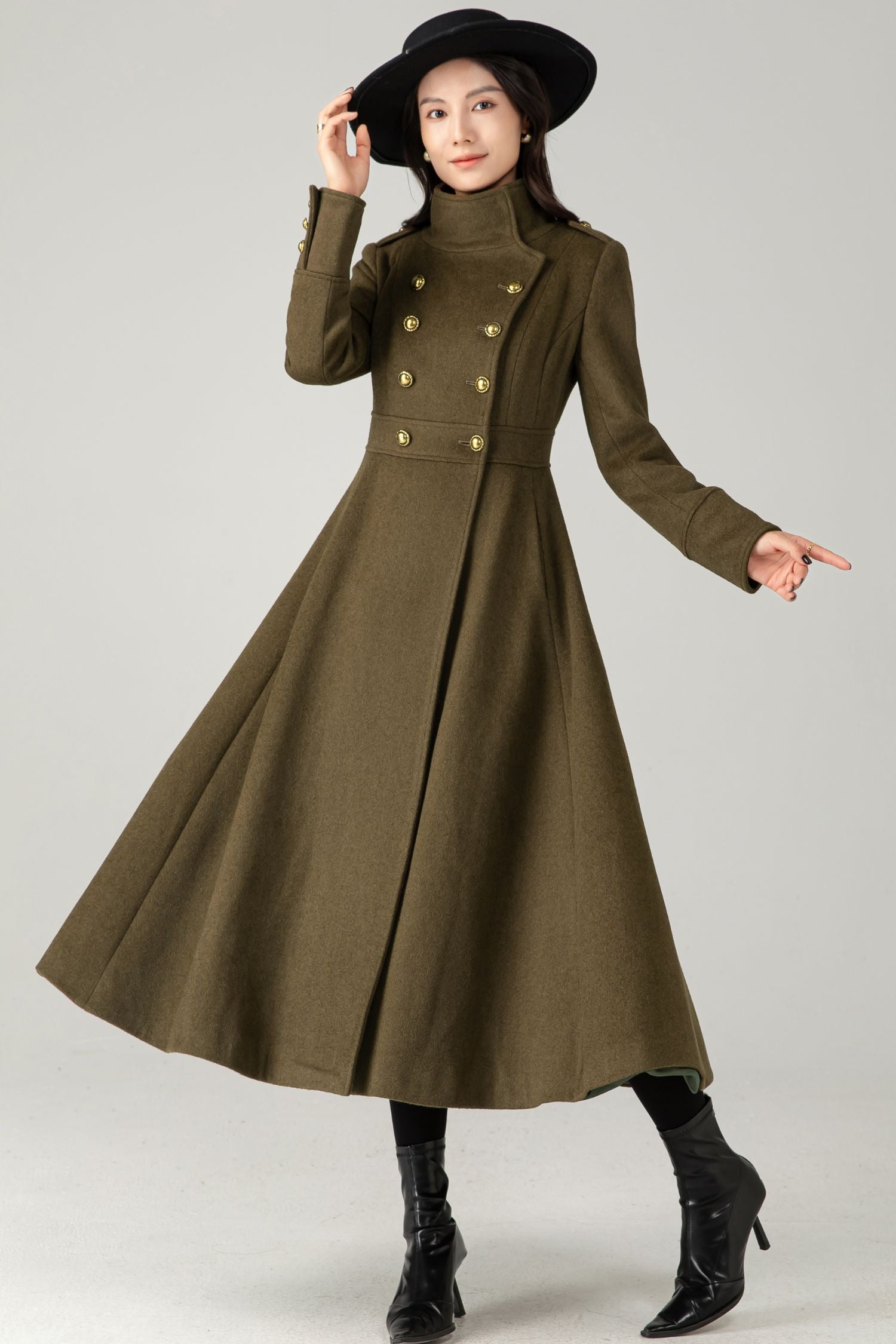 Green Wool Maxi Trench Coat: Double Breasted Long Winter Overcoat C5344
