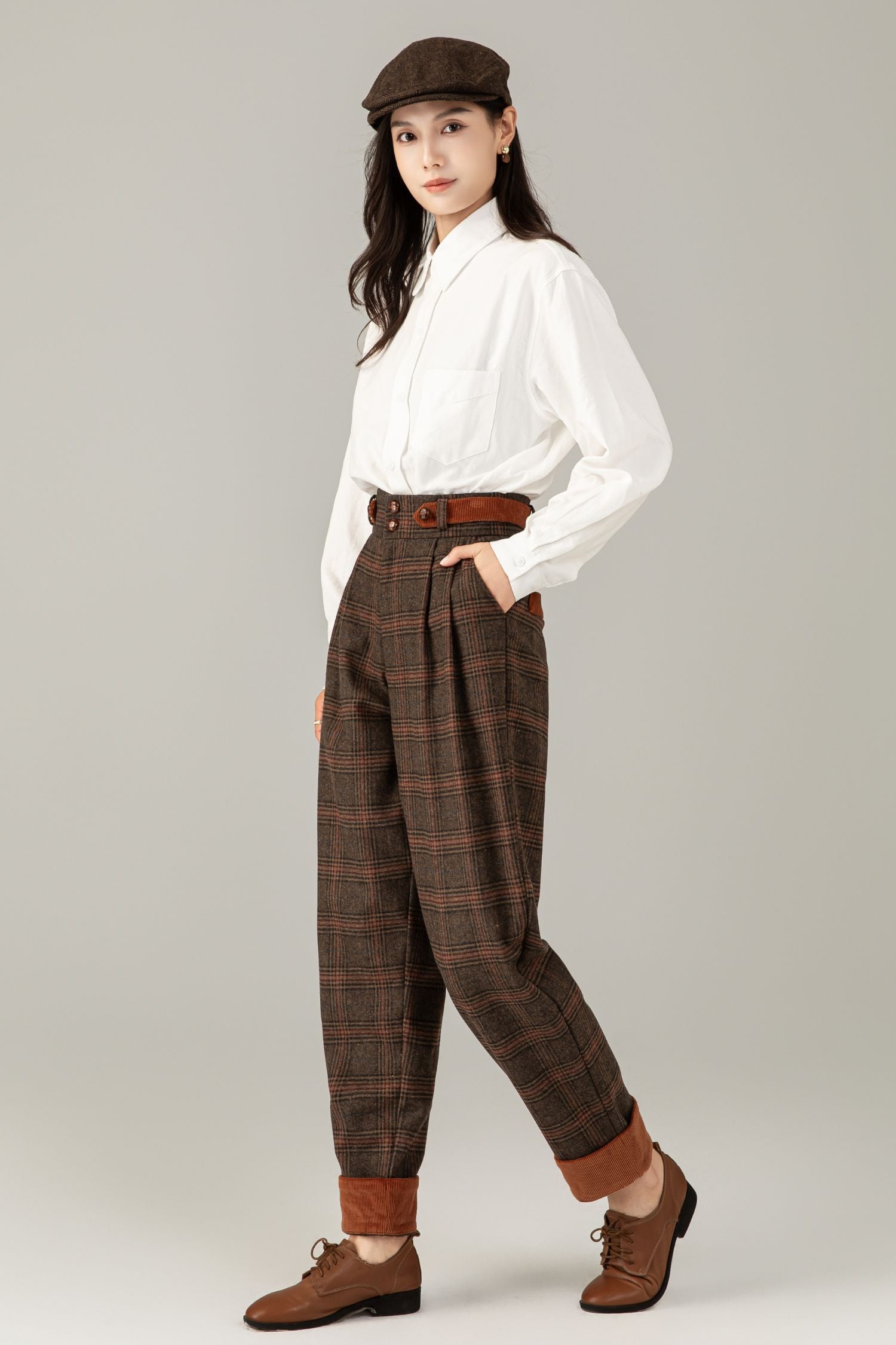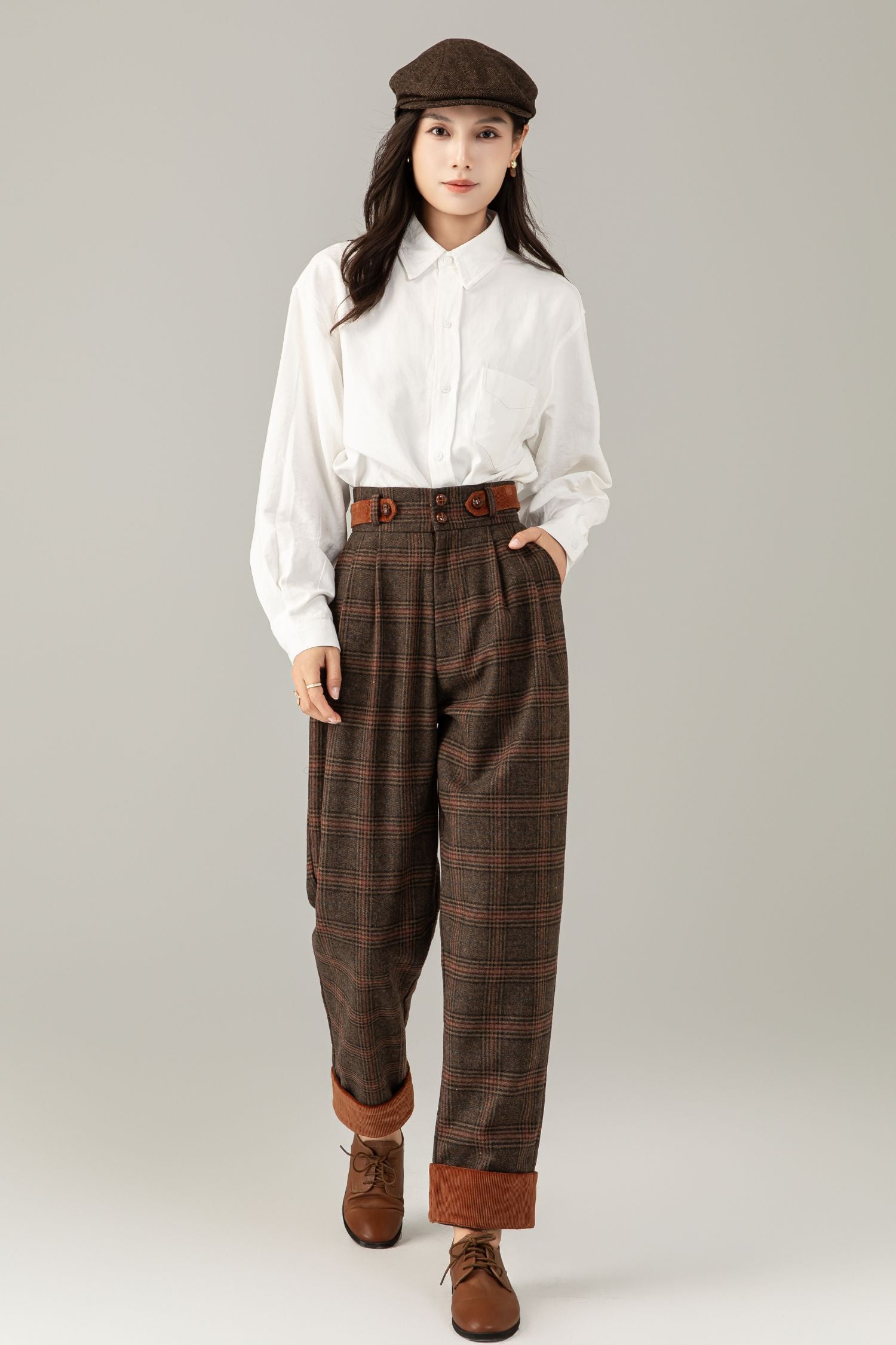 Elevate your look with these brown plaid wool trousers! Made from quality wool, they’re warm & comfy. High - waist with a stylish belt, retro plaid pattern, and roll - up cuffs for charm. Pockets add practicality. Perfect with a white shirt or for dressing up—versatile for any occasion.