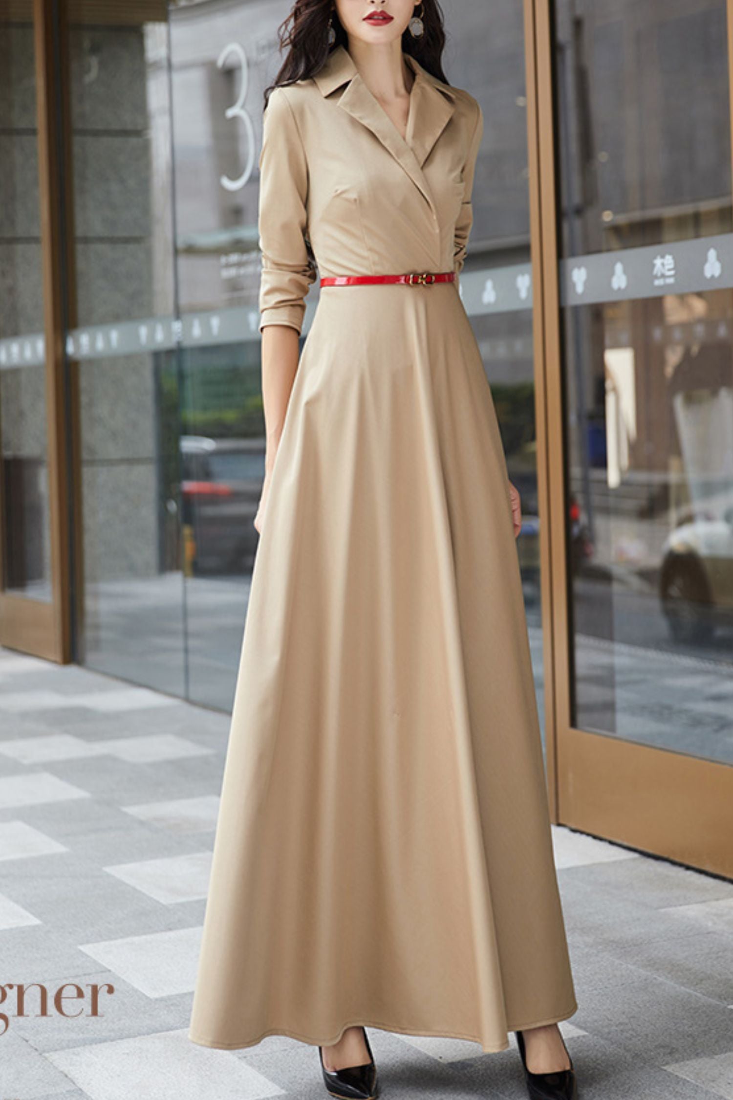 Indulge in timeless elegance with our Khaki long-sleeved suit collar long dress. Crafted with intricate details and a sleek silhouette, this dress exudes luxury and sophistication. Perfect for any occasion, it offers both style and comfort. Elevate your wardrobe with this exclusive piece.