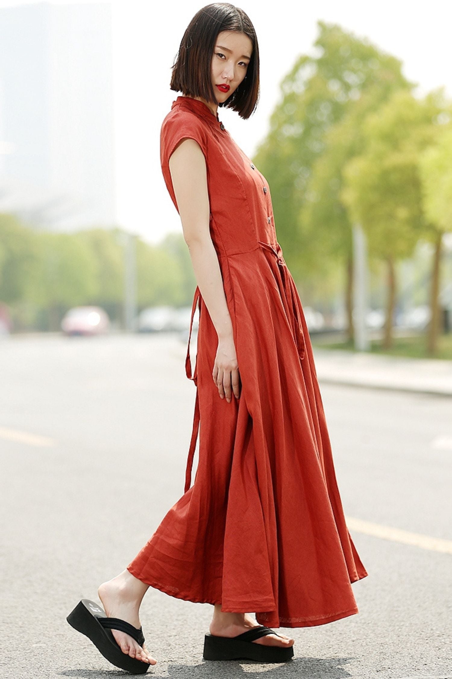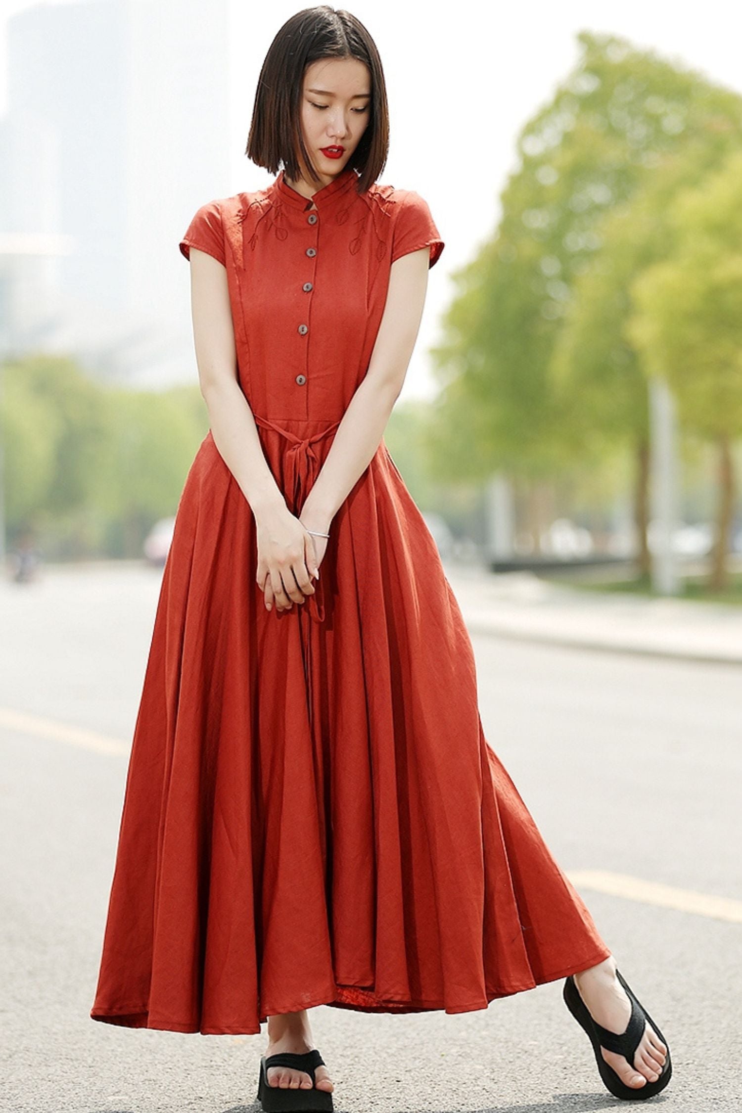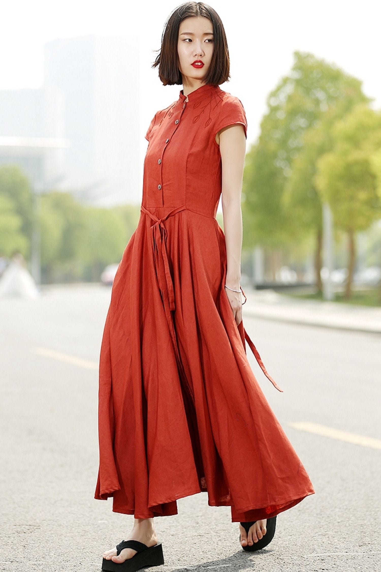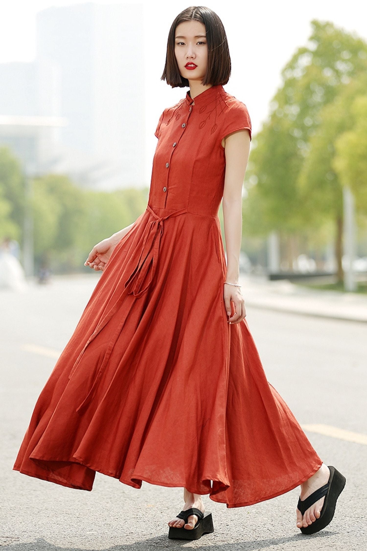 Embrace the summer heat in our linen maxi dress! The vibrant orange color and short sleeves keep you cool while the dress's maxi length adds elegance to any occasion. Lightweight and comfortable, this dress is a must-have for your summer wardrobe!
