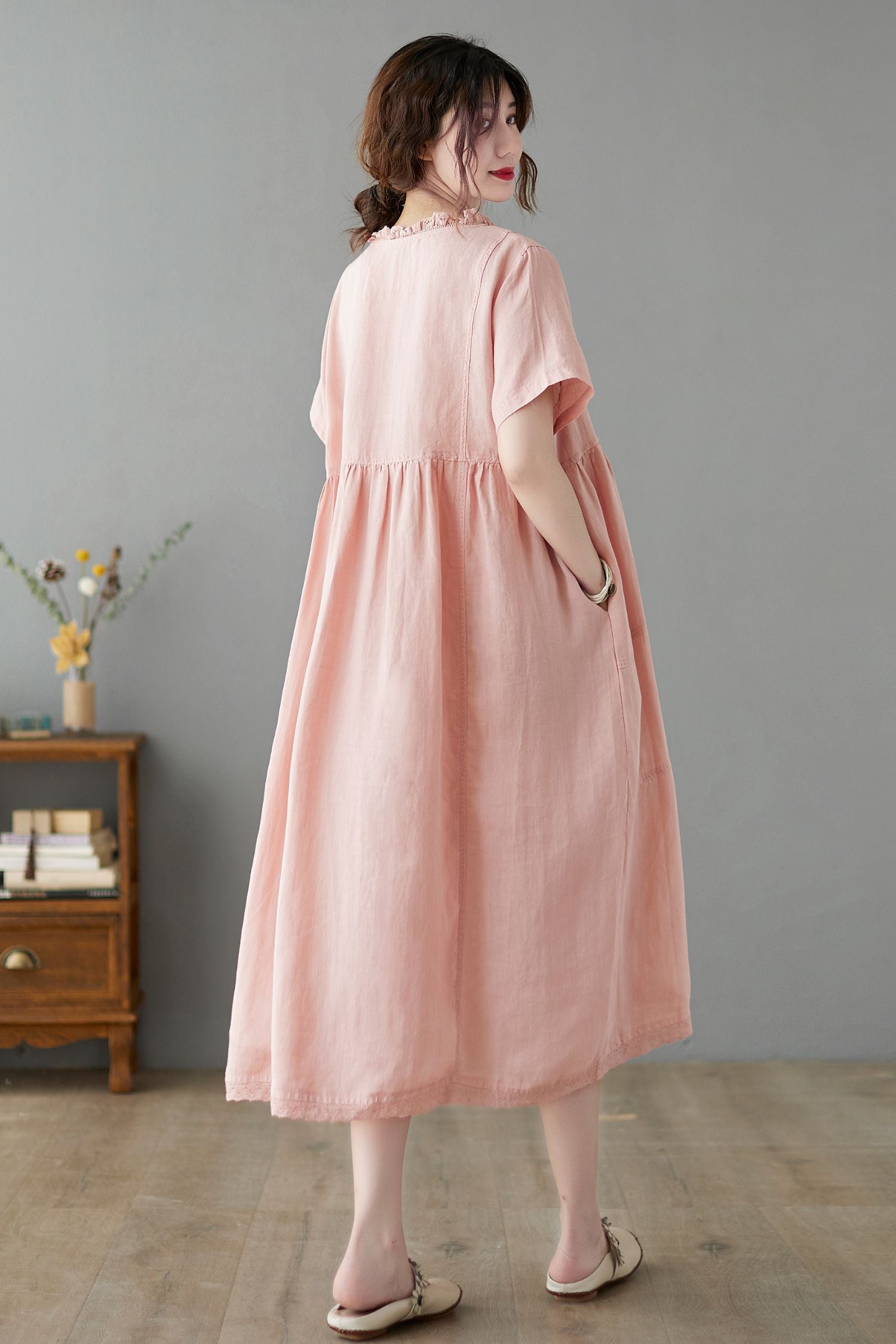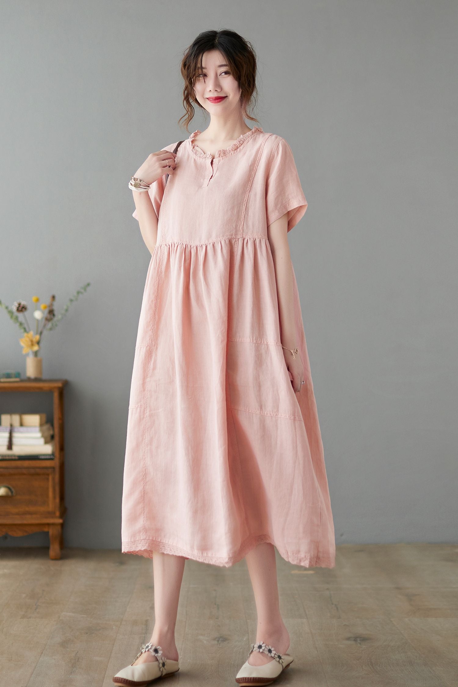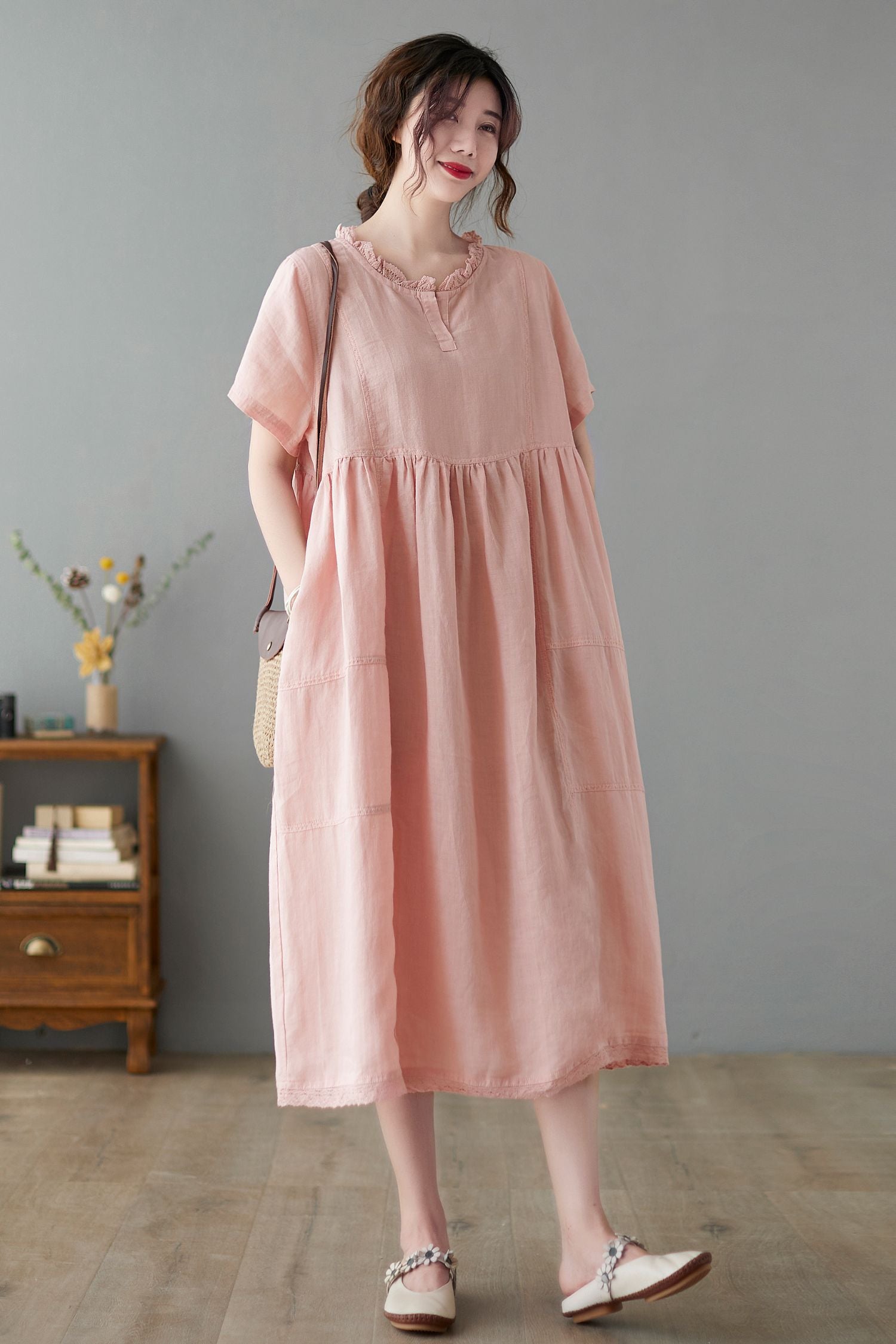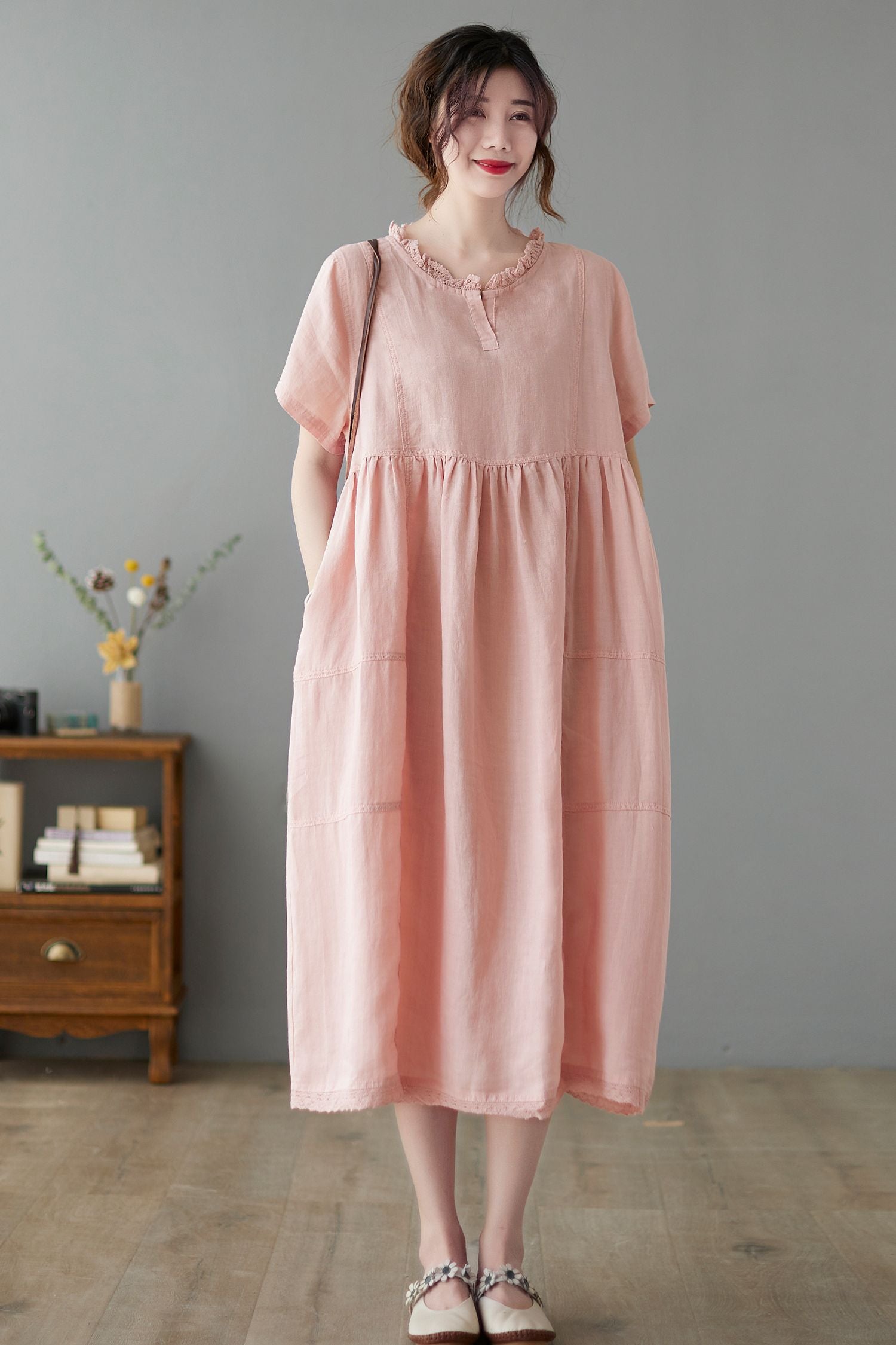 Midi Linen Casual Pink Swing Loose Fit Dress C2247