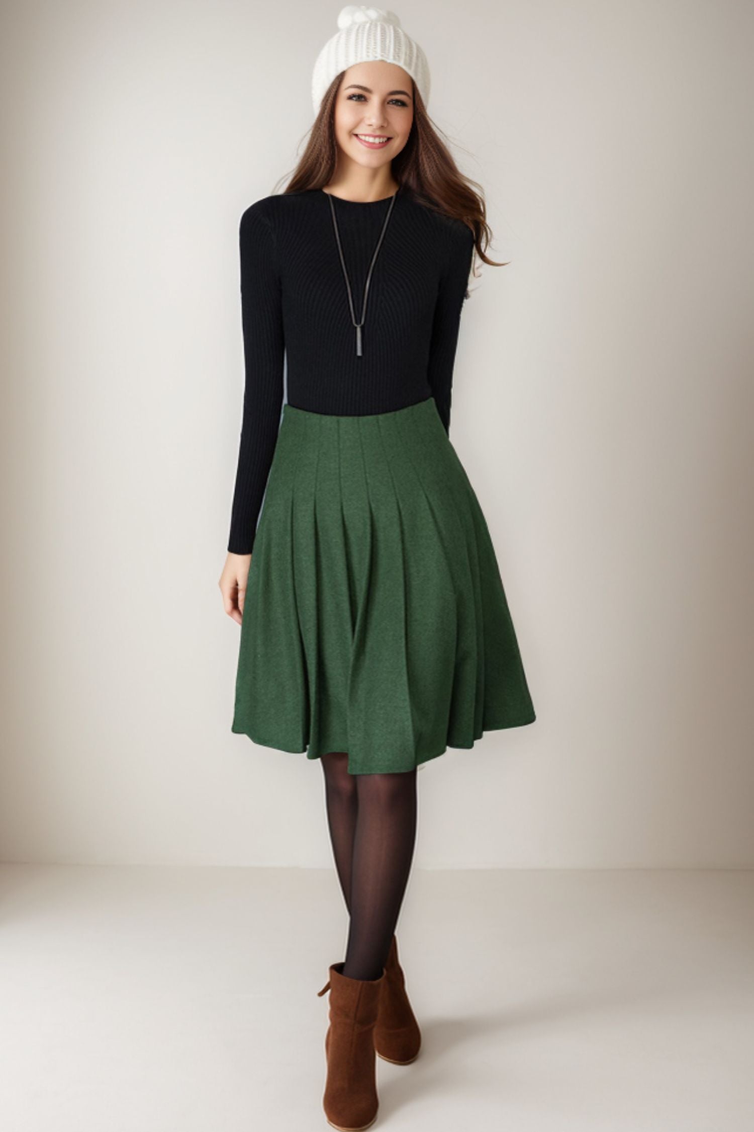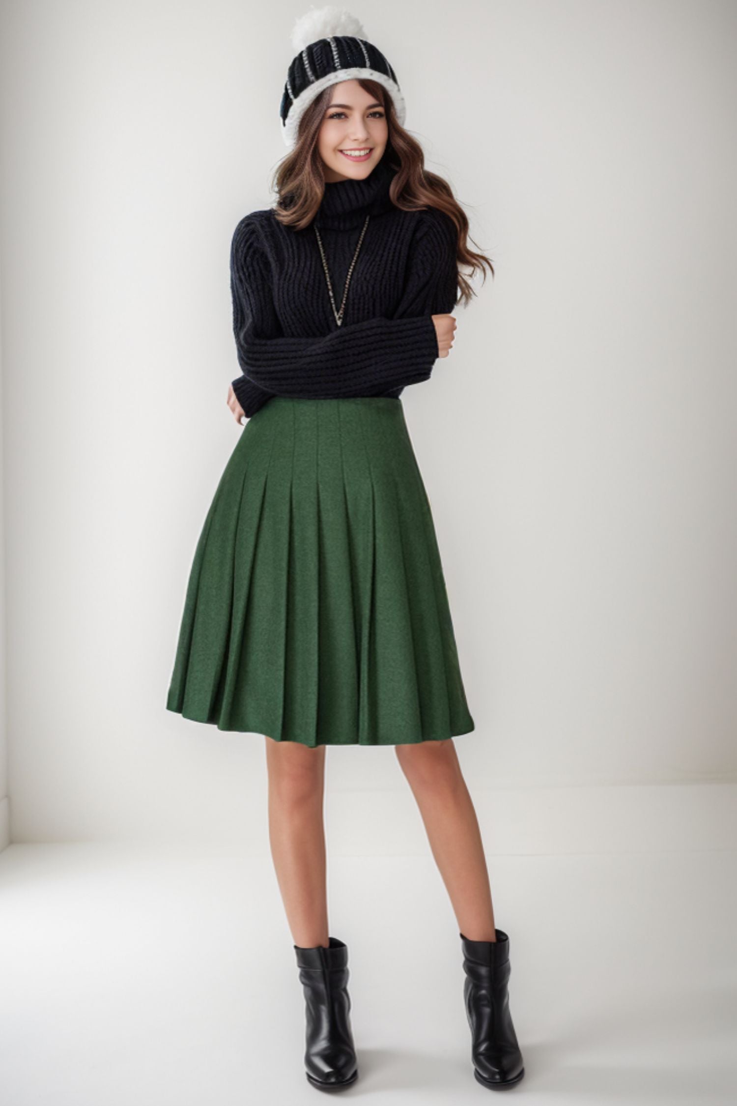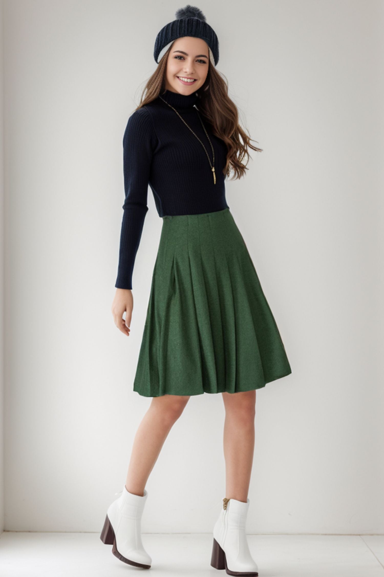 Experience the perfect combination of style and comfort with our Midi pleated wool short skirt in green! Made with high-quality wool, this skirt offers a luxurious feel and a flattering, feminine silhouette. The midi length and pleated design add a touch of elegance, making it the ideal choice for any occasion. Upgrade your wardrobe today!